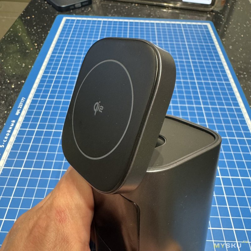 Сверху — площадка беспроводной зарядки мощностью 15W. Причём площадка эта откидная и довольно упругая, с поддержкой MagSafe