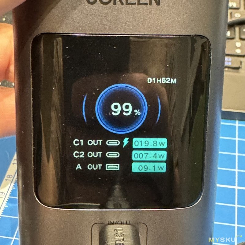 Единственное что там не отображается вообще и никак, так это использование панели беспроводной зарядки. Нет, повербанк конечно «проснётся», если положить на него телефон и на экране отобразится количество оставшихся процентов. Но он сделает тоже самое, если просто его разбудить нажав на кнопку. Ладно, тут я немного некорректно выразился. Кое что всё таки отображается — оставшееся время разрядки повербанка. Причём я эту опцию обнаружил буквально на днях, пока писал обзор. Ну как обнаружил… Я к ней логически пришёл, а потому проверил. И действительно если просто разбудить повербанк, время там будет 99 часов и 99 минут. А если на него положить телефон, то он покажет время до полной разрядки. Но, вернёмся к портам.