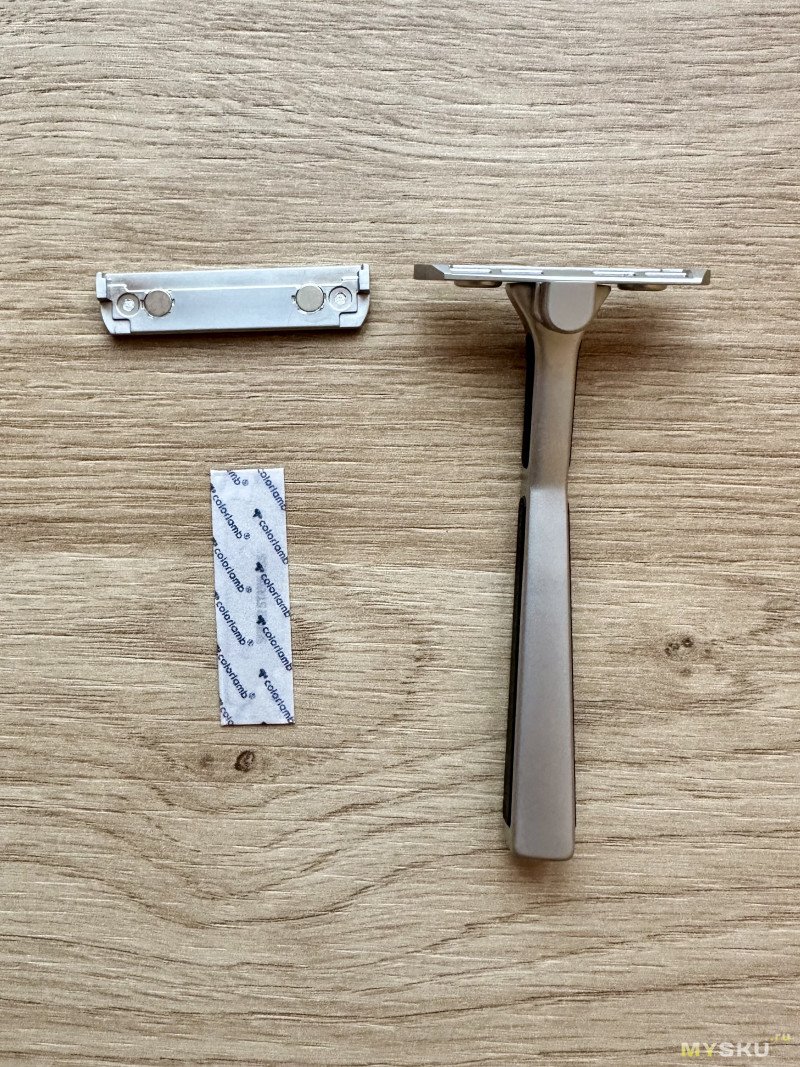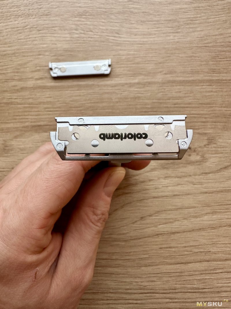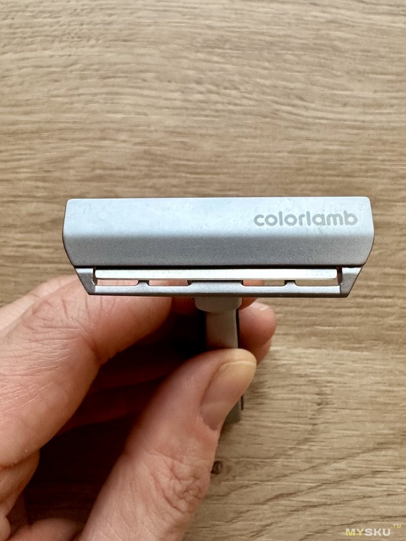 Интересное и весьма необычное решение, но почему бы и нет — что-то новенькое. Непосредственно на бритьё это никак не влияет. При желании бритву можно будет разобрать, но такую необходимость я слабо представляю, так как места она и так занимает мало. Ну только если захочется основательно её почистить со временем. Хотя я предпочитаю хорошенько промывать и вытирать насухо станок сразу после бритья.Другим объяснением подобной фиксации головы и ручки может быть то (и это более вероятно), что фирма Colorlamb также выпускает складную походную бритву в форм-факторе складного ножа. Голова у этой бритвы идентичная бритве с фиксированной ручкой, но складной механизм предусматривает вращение головы под 90 градусов относительно ручки, и вращение это происходит аккурат в месте расположения винта под шестигранник у бритвы из моего обзора. Короче голову сделали универсальной, а ручки под нее на выбор — фиксированная или складная.