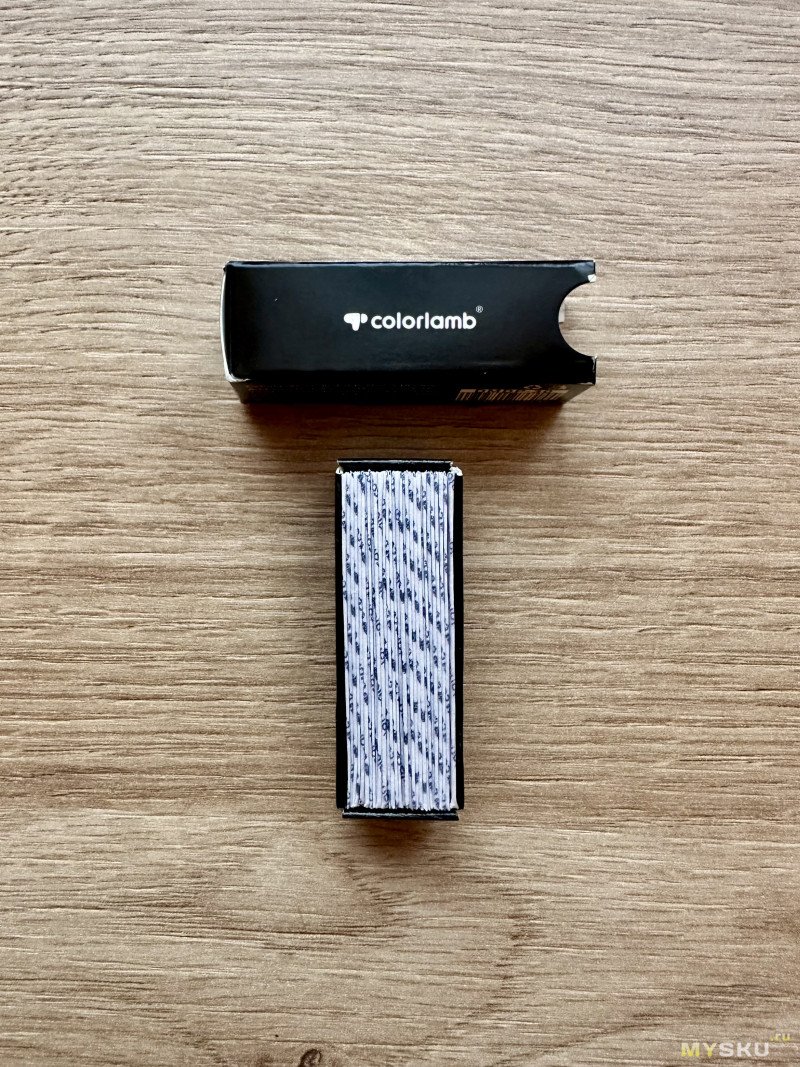 По традиции начнём обзор с упаковки, в которой товар поставляется- это аккуратная коробочка из переработанного картона. Выглядит весьма достойно и аккуратно. Внутри нас ждёт бритва, подвижность которой ограничена картонной вставкой, а также упаковка из 30 половиной лезвий также фирмы Colorlamb.