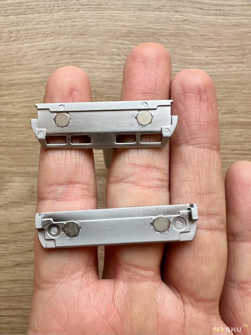Магниты расположены и на крышке, и на нижней плите ( по 2 на каждой), и они также участвуют в фиксации лезвия.