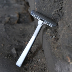 Что же касается самой бритвы, то представляет она из себя SE (single edge) т-станок — то есть т-станок под половинку обычного двустороннего (DE — double edge) лезвия. Бритва сделана из цинкового сплава и имеет матовую поверхность. Также к особенностям дизайна можно отнести изогнутую ручку — выглядит очень даже симпатично и необычно.