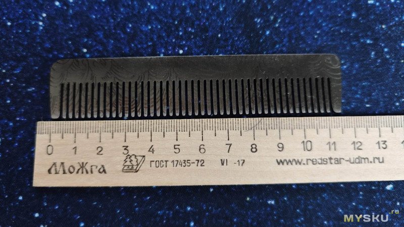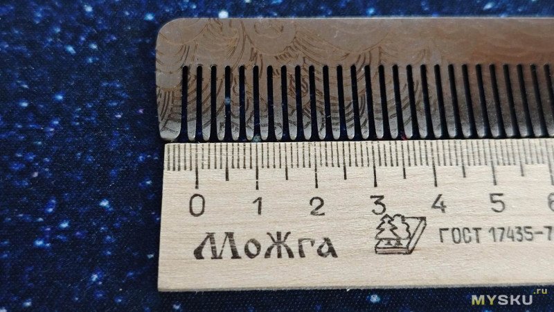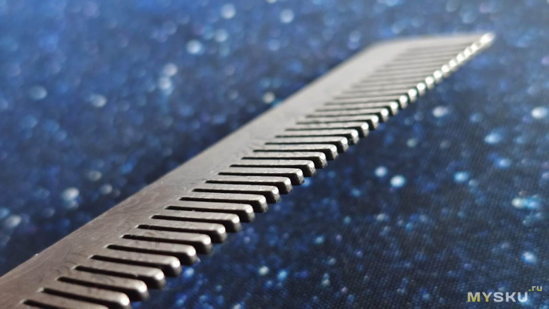 У расчески 43 зубца высотой 14 мм, шириной 2 мм и расстоянием между зубцами 1 мм.