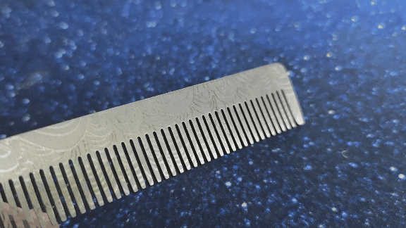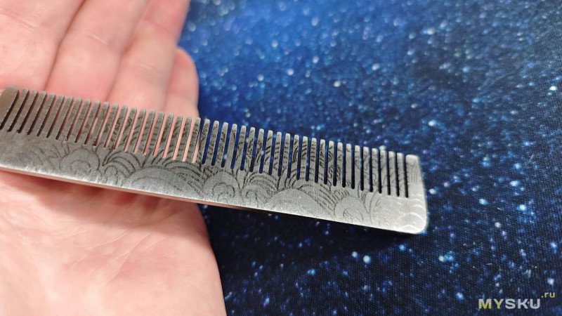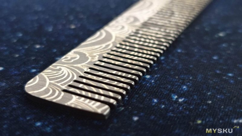 Всю переднюю часть расчёски покрывает орнамент, который меняет свой оттенок под разными углами наблюдения.