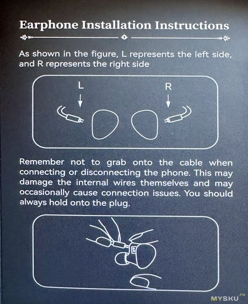 Посадка у наушников достаточно удобная не смотря на то, что корпус наушников не имеет выраженных анатомических вырезов — дискомфорта при длительном ношении наушники не вызывают и на уши не давят. Кабель по весу фактически не ощущается, не давит заушинами и не натирает. Кабель конечно не дорогой, но по качеству в любом случае несколько лучше, чем стоковый у KZ. К чрезмерному запутыванию не склонен.