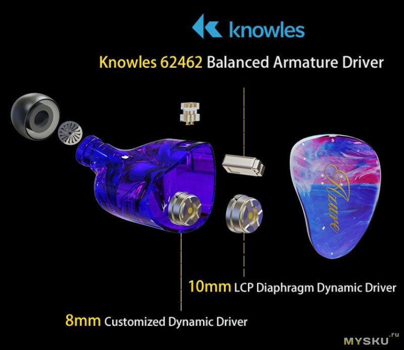 Динамический драйвер 10 мм создаёт наполненность звучания благодаря работе в диапазоне 20 Hz — 15kHz. Динамический драйвер 8 мм помогает выделить звучание низких частот в диапазоне 20 Hz — 400 Hz, помогая им быть мощными и четкими. А арматурный драйвер Knowles 62462 добавляет кристальности и чистоты звучанию в диапазоне от 5 кHz до 20 kHz.