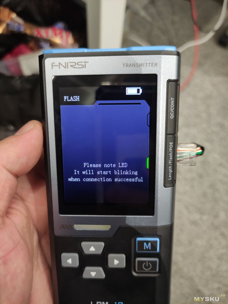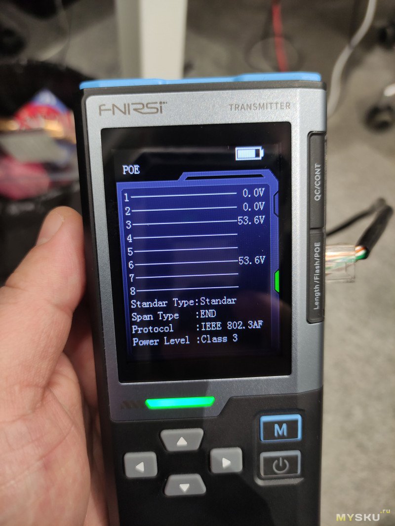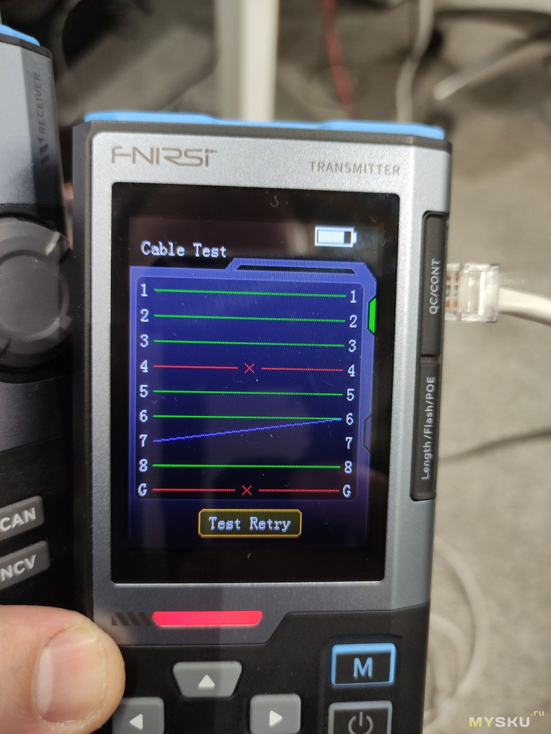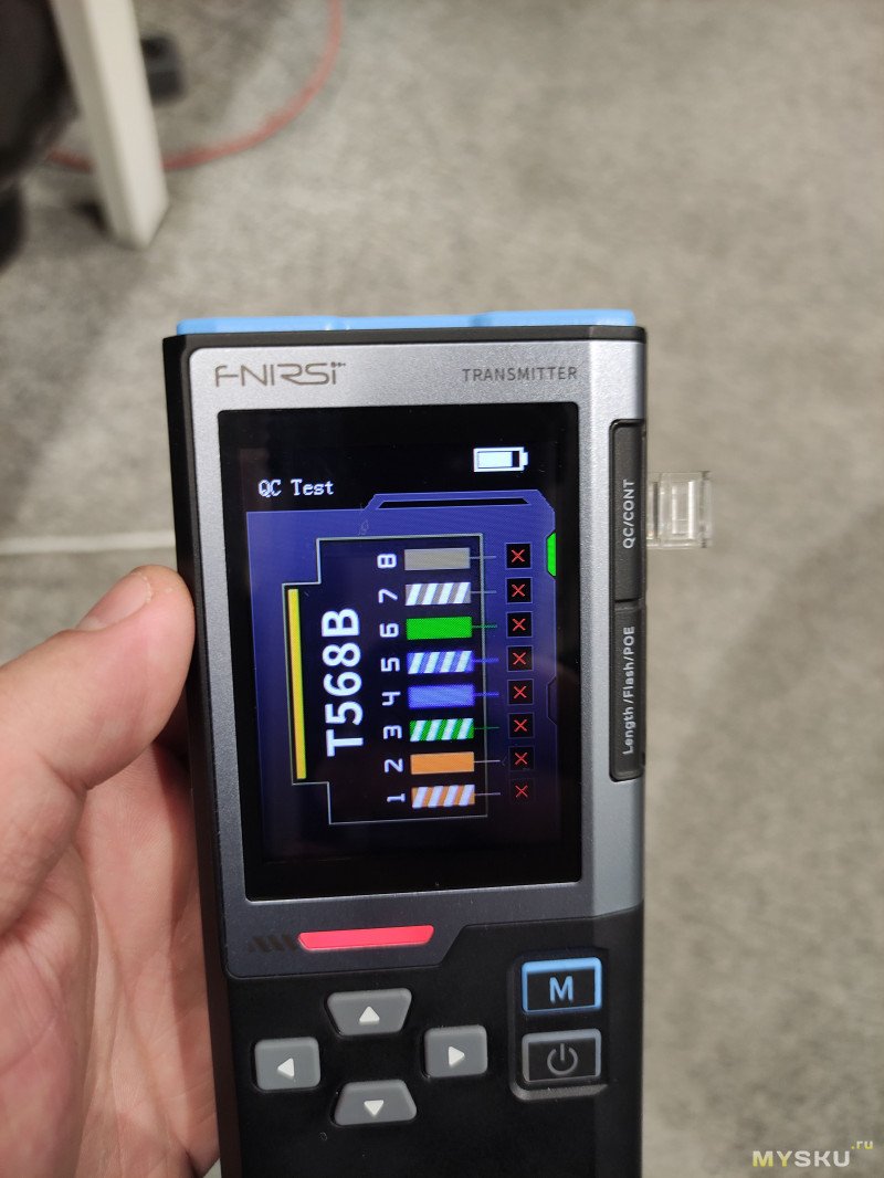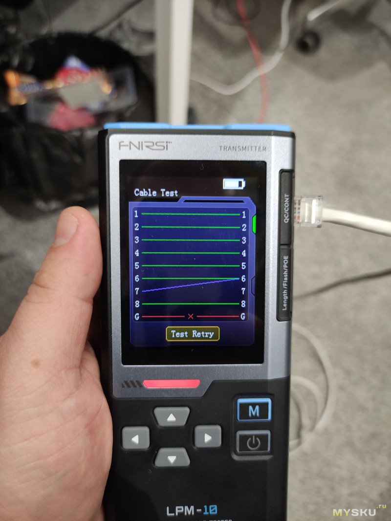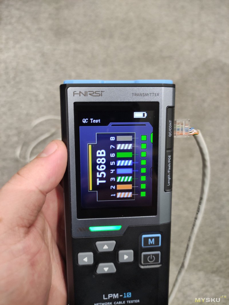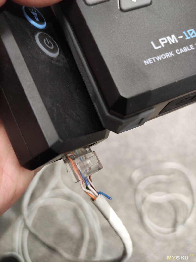 Итак, следующий режим проверки качества обжима кабеля. Для его работы не требуется подключать ответную часть устройства. Он работает скорее всего по тому же принципу что и режим проверки длины. К сожалению я не смог обжать кабель некачественно, не хвастаюсь, но реально обжимка видать хорошая слишком была.Но я нашел способ показать как эту функцию чекнуть. Сначала проверим хорошо обжатый кабель.