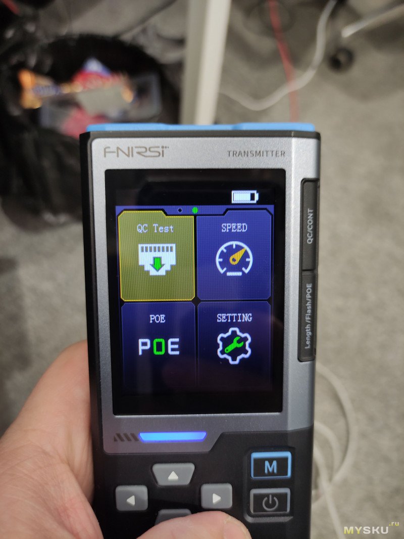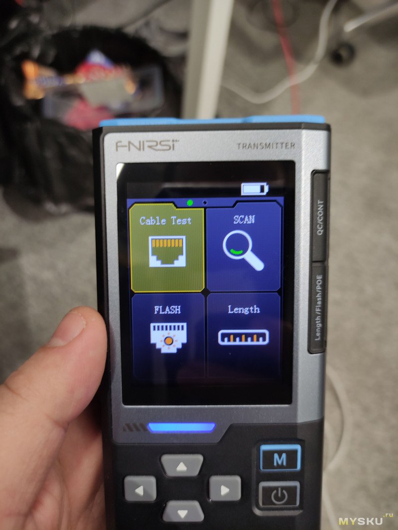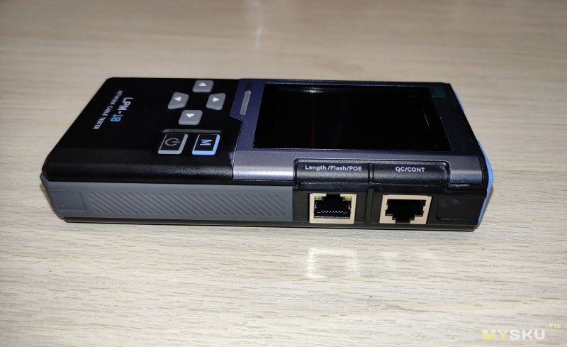 Лицевая часть снабжена дисплеем с диагональю 2.4 дюйма. Качество дисплея среднее, как на стареньких кнопочных телефонах пиксели крупные, но больше сюда в принципе и не нужно, 6 кнопками управления, 4 стрелочки для навигации между функциями, Кнопка M для провала в выбранный пункт меню, кнопка питания с коротким нажатием работает как выход из пункта меню, с длинным как включение и выключение устройства. Так же на лицевой панели имеется трехцветный светодиодный индикатор, который горит синим при включенном устройстве, зеленым при успешном прохождении теста и красным при ошибке или провале теста.