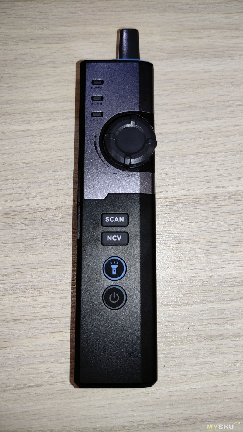 На фронтальной части имеются следующие элементы: кнопка включения устройства, кнопка включения подсветки, кнопка активации режима NCV, кнопка включения режима трассоискателя, крутилка громкости, и три индикаторных светодиода.