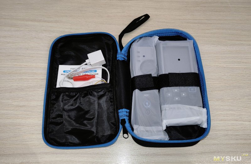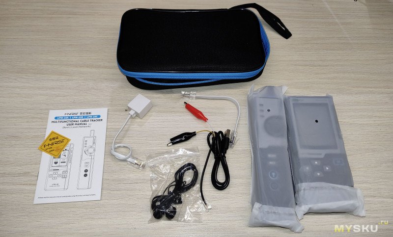 Имеется Основной аппарат, уловитель (он же ответная часть для прозвонки пар), зарядный кабель Type-C, короткий плоский патчкорд RJ-45, адаптер для подключения к телефонной линии RJ-11. переходник на крокодильчики для подцепки к линии, наушники для подключения к уловителю, для удобства трассировки в шумном месте, инструкция и знак качества F-nirsi.