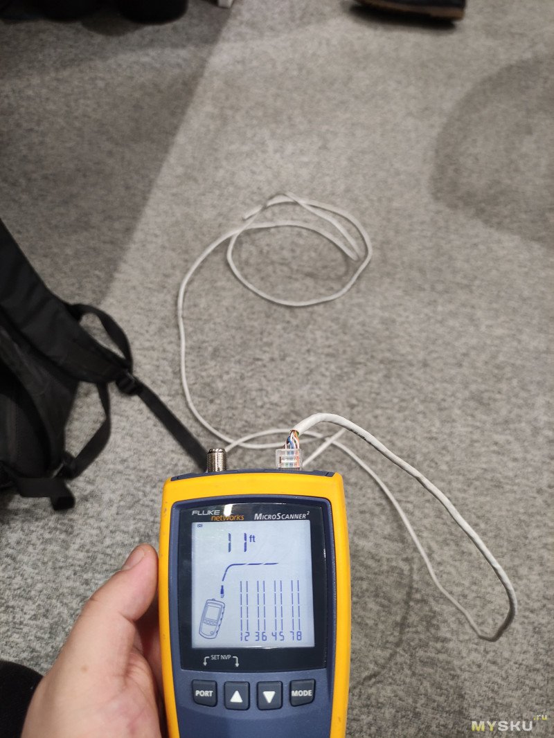 Опробуем немаловажную функцию проверки длины кабеля, и даже сравним показания с дорогущим флюком. Кабель заранее был измерен длина его около 3,2 метра. Флюк нам показал 11 футов это в переводе на сантиметры 3.35метра.