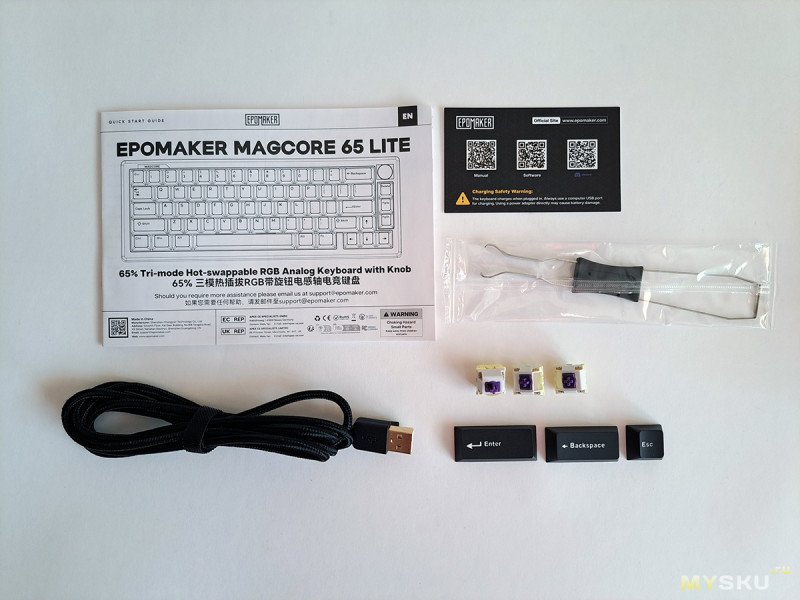 В комплекте руководство пользователя на разных языках (русского нет), карточка с QR-кодами-ссылками на официальный сайт, USB кабель, пуллер для извлечения кейкапов и свитчей, три запасных индуктивных свитча. И признак хорошего тона – есть возможность заменить акцентные кейкапы на обычные, в тон остальной клавиатуры.