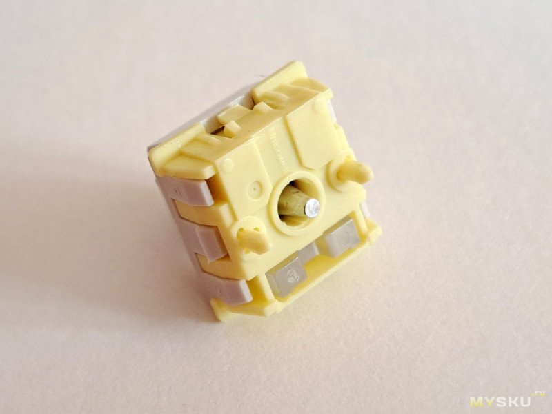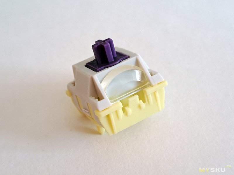 Давайте вытащим один из свитчей из гнезда. Посредине мы видим отверстие для металлического конуса. Светодиод подсветки расположен снизу. У контактных переключателей, обычно сверху, поэтому и символы на колпачках размещают в верхней половине клавиш.