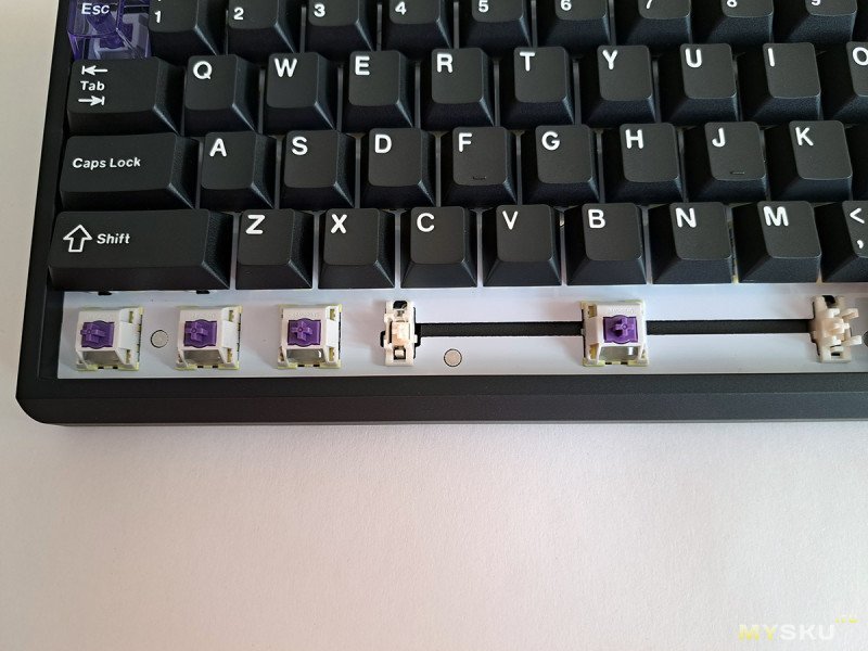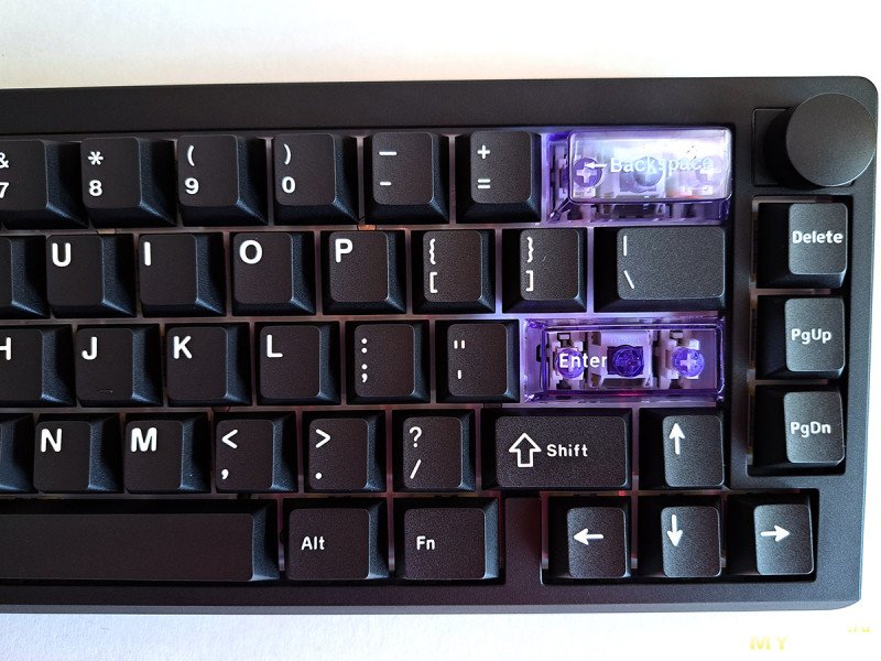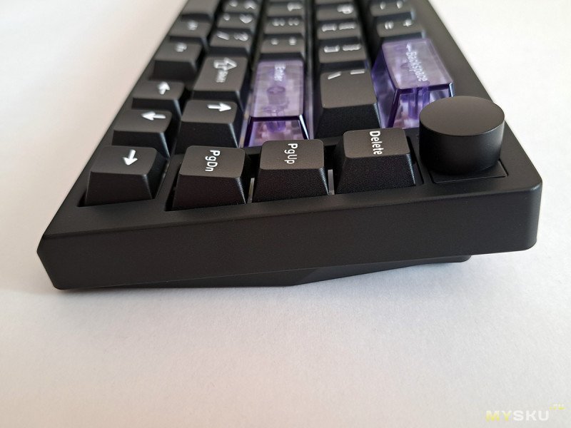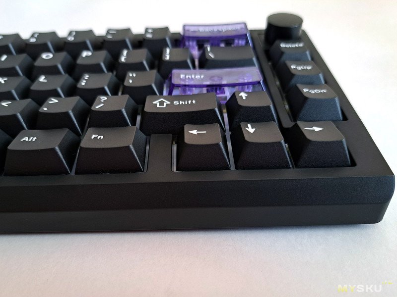 А вот и сама клавиатура. Вроде бы скучный черный цвет, но с акцентными прозрачными фиолетовыми кейкапами выглядит необычно.
