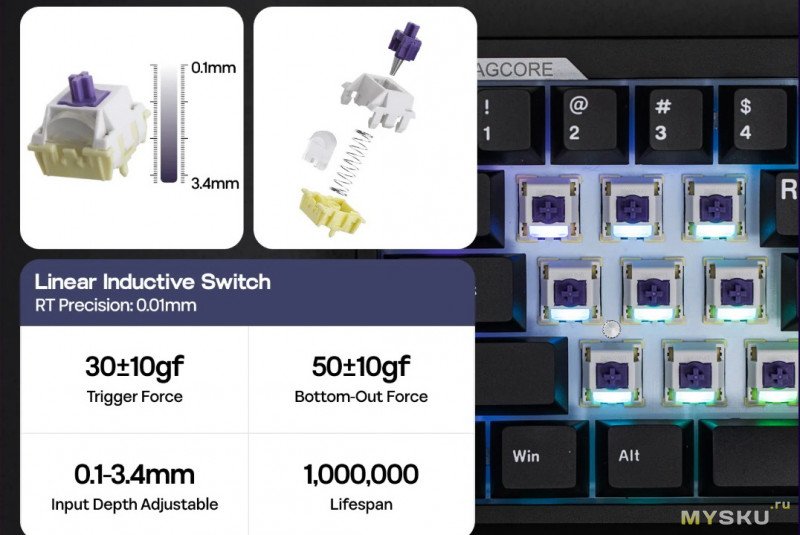 Важно отметить, что для реализации всех преимуществ магнитных и индуктивных переключателей крайне важна аппаратная составляющая клавиатуры (плата), а также программное обеспечение. И поэтому, тут довольно низкая взаимозаменяемость. Данные виды переключателей не получится заменить на контактные. А также, на обозреваемую клавиатуру нельзя поставить магнитные переключатели.