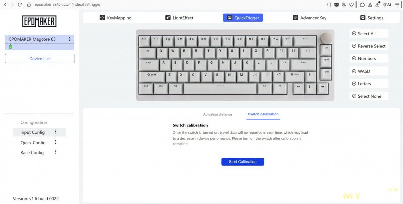 На следующей вкладке можно настроить точку срабатывания переключателей. А также включить режим Rapid Trigger. Есть возможность откалибровать свитчи.