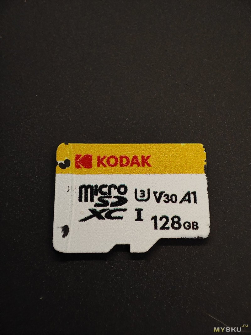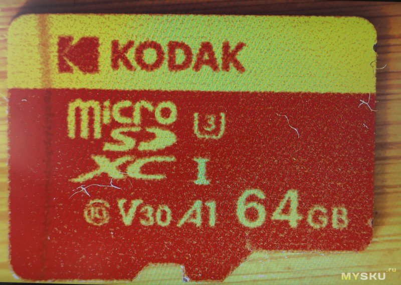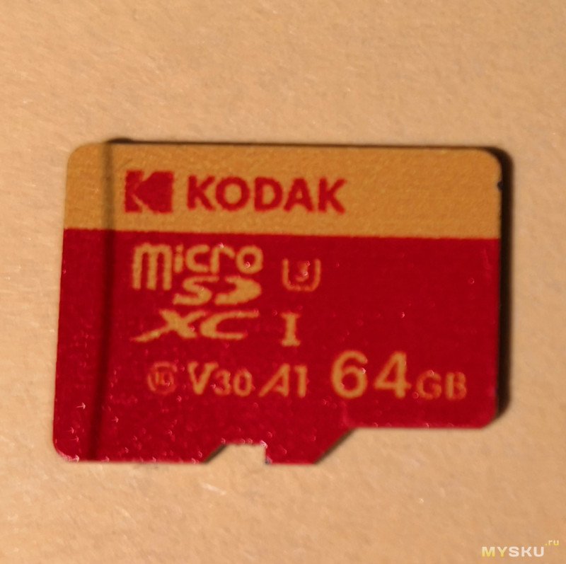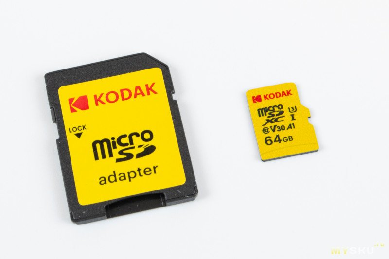 Еще один Kodak, но уже чисто желтый (соответственно Y, брал за те же 289₽) и с адаптеров в комплекте, по маркировке — EKMSDM64GXCU3KWA. Заявленные «стандарты», все те же самые — Class 10, U3, UHS-I, V30, A1.
