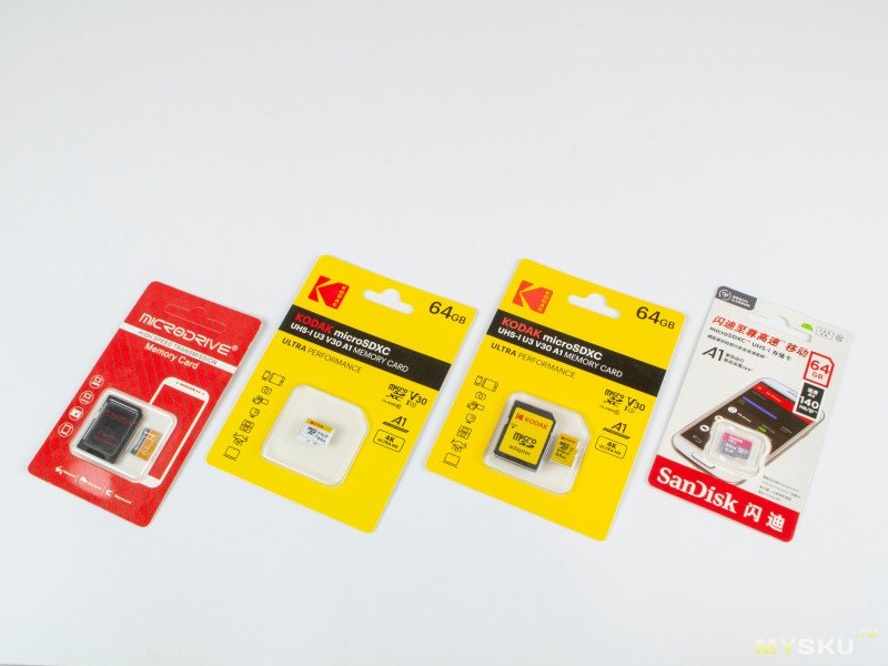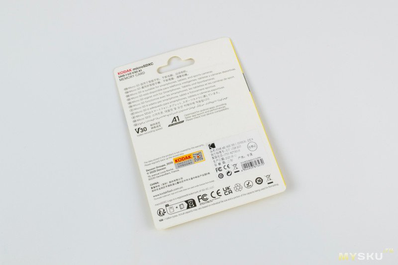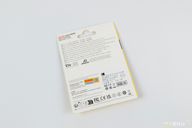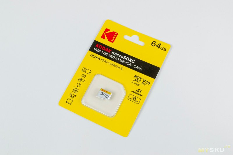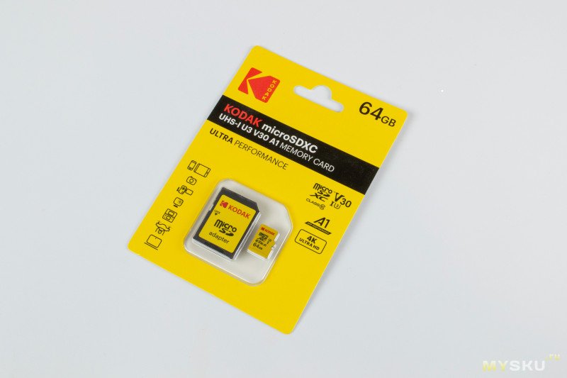 Бело-желтый Kodak, без адаптера (будем дальше называть Kodak W, брал за 289₽). Судя по упаковке, его маркировка EKMSDM64GXC10HPRK. Здесь уже все более «серьезно», помимо Class 10, U3, UHS-I, указаны и V30 и A1.