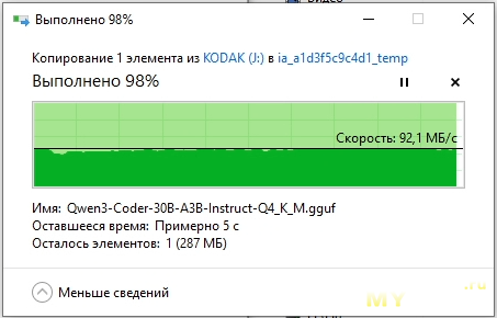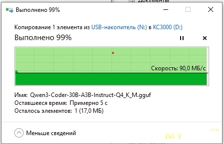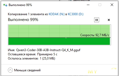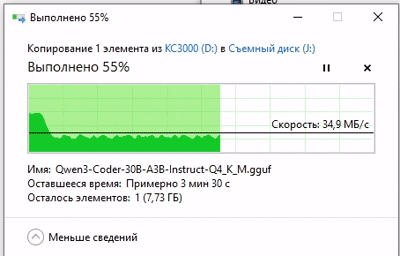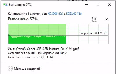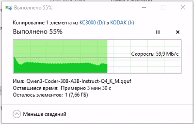 Скопируем тестовый файл с карт памяти на KC3000 и посмотрим с какой скоростью он (файл) будет вычитываться.