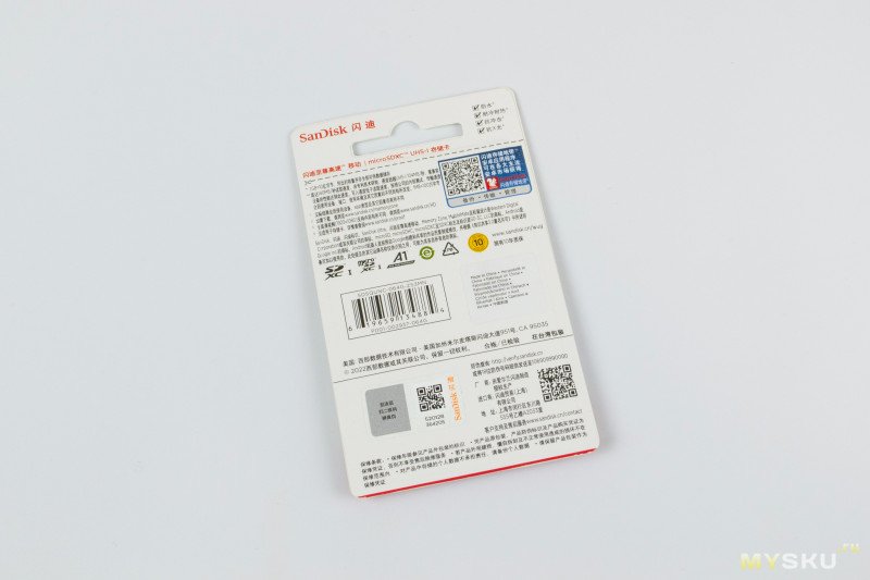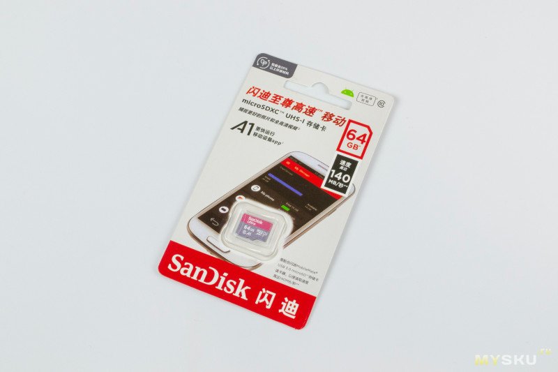 И последний — SanDisk Ultra (SDSQUNC-064G-ZS3MN, брал за 280,87 ₽). Class 10, U3, UHS-I, A1 на месте, но зажали указать класс V. Зато указали на упаковке про 140 MB чего-то там, думается что стандартно речь о последовательном чтении.
