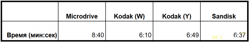 На удивление (на самом деле нет, если вы заметили значение средней скорости в HD Tune), самым быстрым оказался белый Kodak. Далее идет СанДиск, желтый Кодак и Микродрайв.