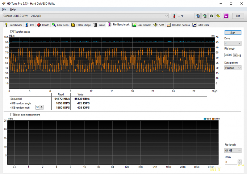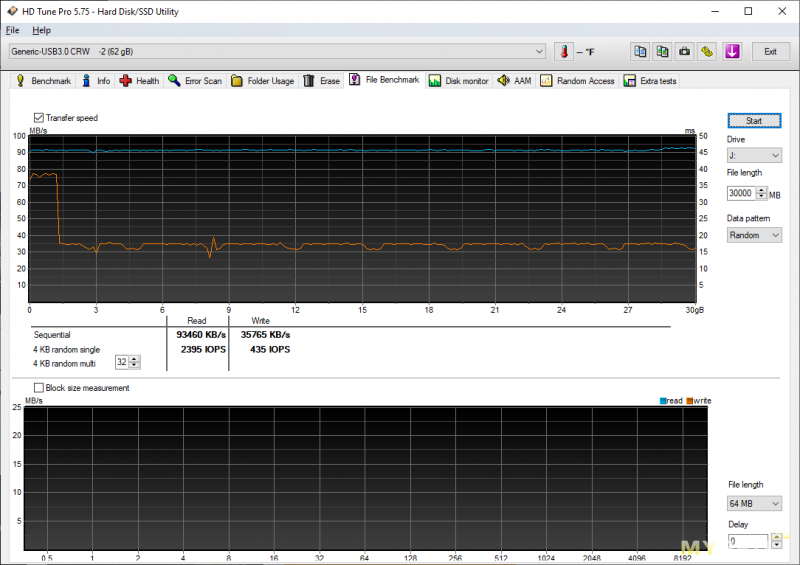 А вот HD Tune дает несколько больше информации. И если скорость вычитки тестового файла тут коррелирует с CDM (возможно предел «в сотку» — это ограничение картридера), то график записи дает несколько другие данные. Все, кроме Микродрайва, показывают «пилу» разной степени упоротости частоты, но все в пределах 30-80 МБ/с. А сам Микродрайв (и СанДиск) имеет какую-то ступеньку в начале графика (на кэширование не похоже, а pSLC тут не ожидаю увидеть), а далее стабильную (ну относительно других образцов) полку в чуть больше 30 МБ/с.