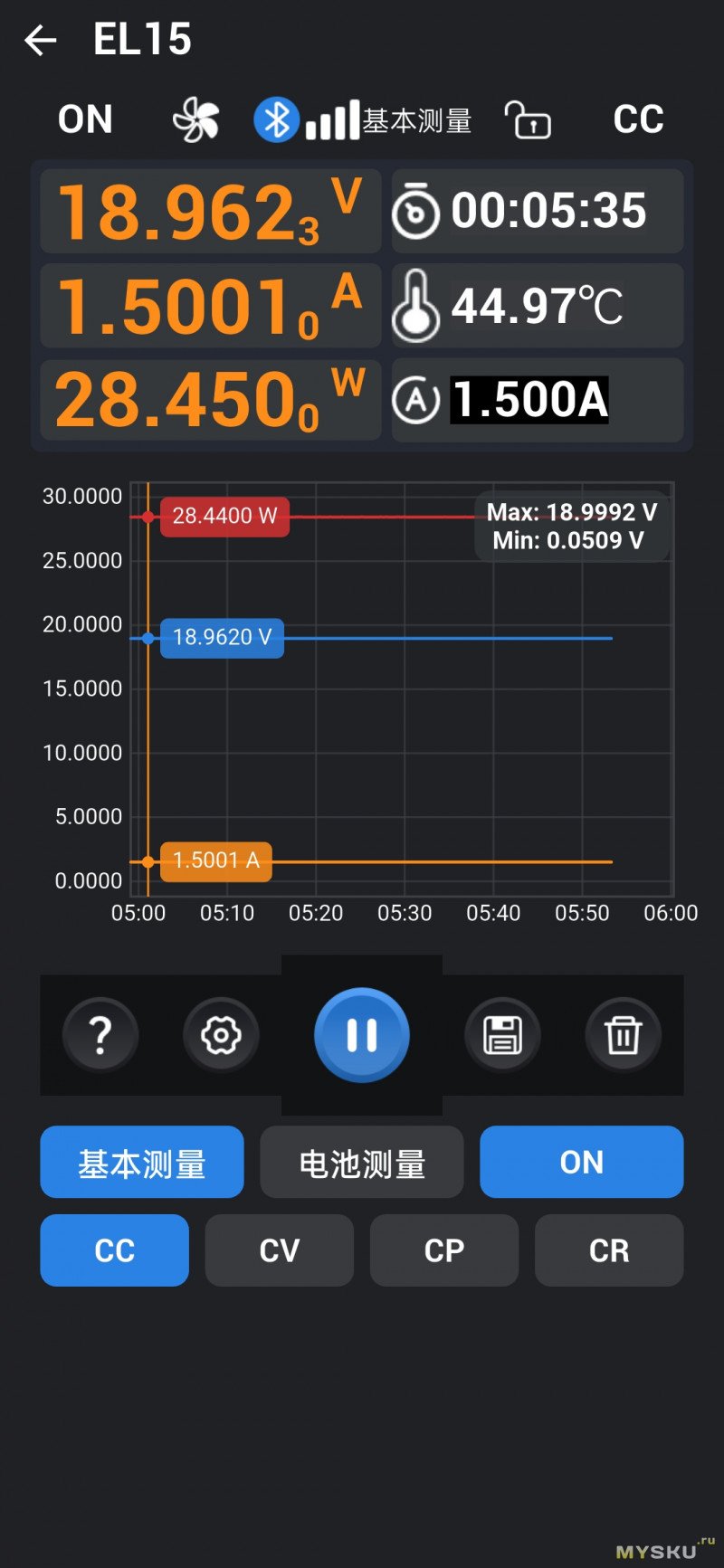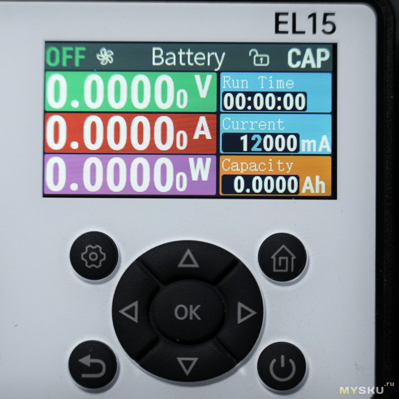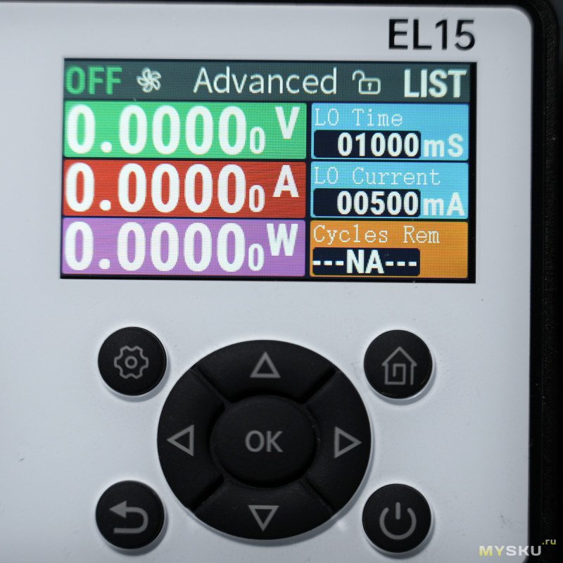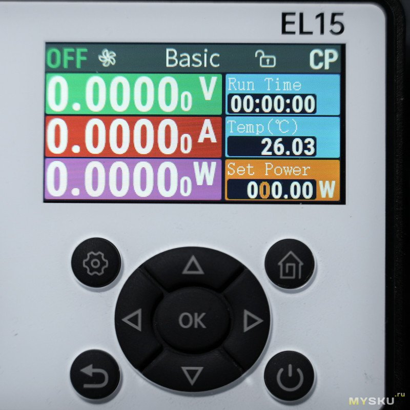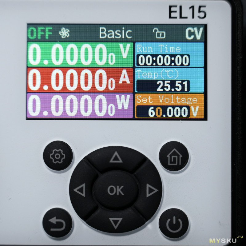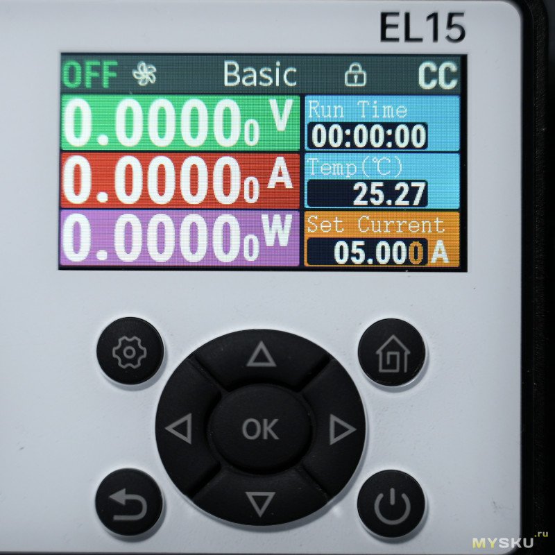 Главное окно Basic отображает текущее напряжение, ток и мощность. Справа — таймер, текущая собственного нагрева, установленный ток. Наверху на панели состояния — 5-лепестковая пиктограмма для визуального обозначения оборотов вентиляторов, OFF/ON — включить/выключить подачу питания на клеммы, режим стабилизации (CV / CC / CP / CR), значок замка (блокировка управления по долгому нажатию на кнопку вкл./выкл.)