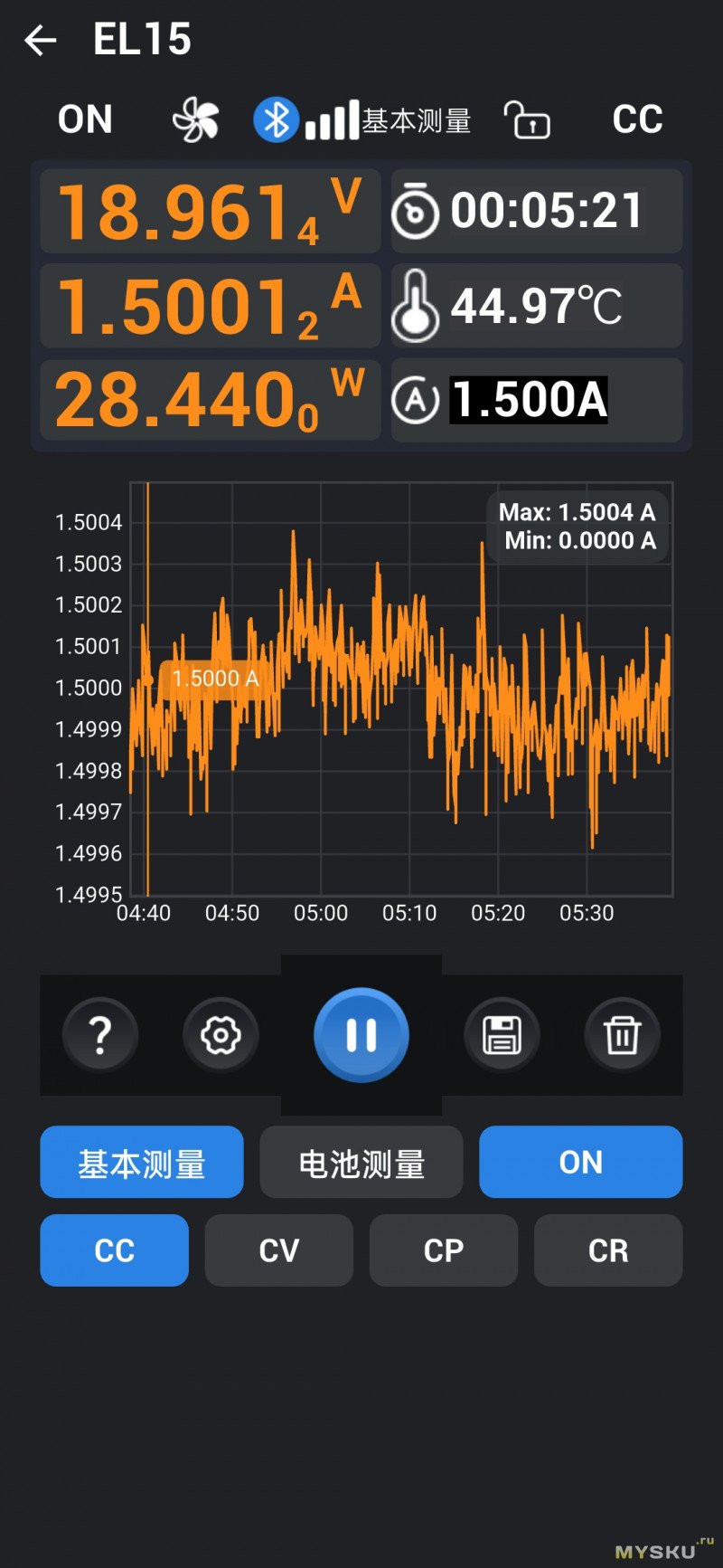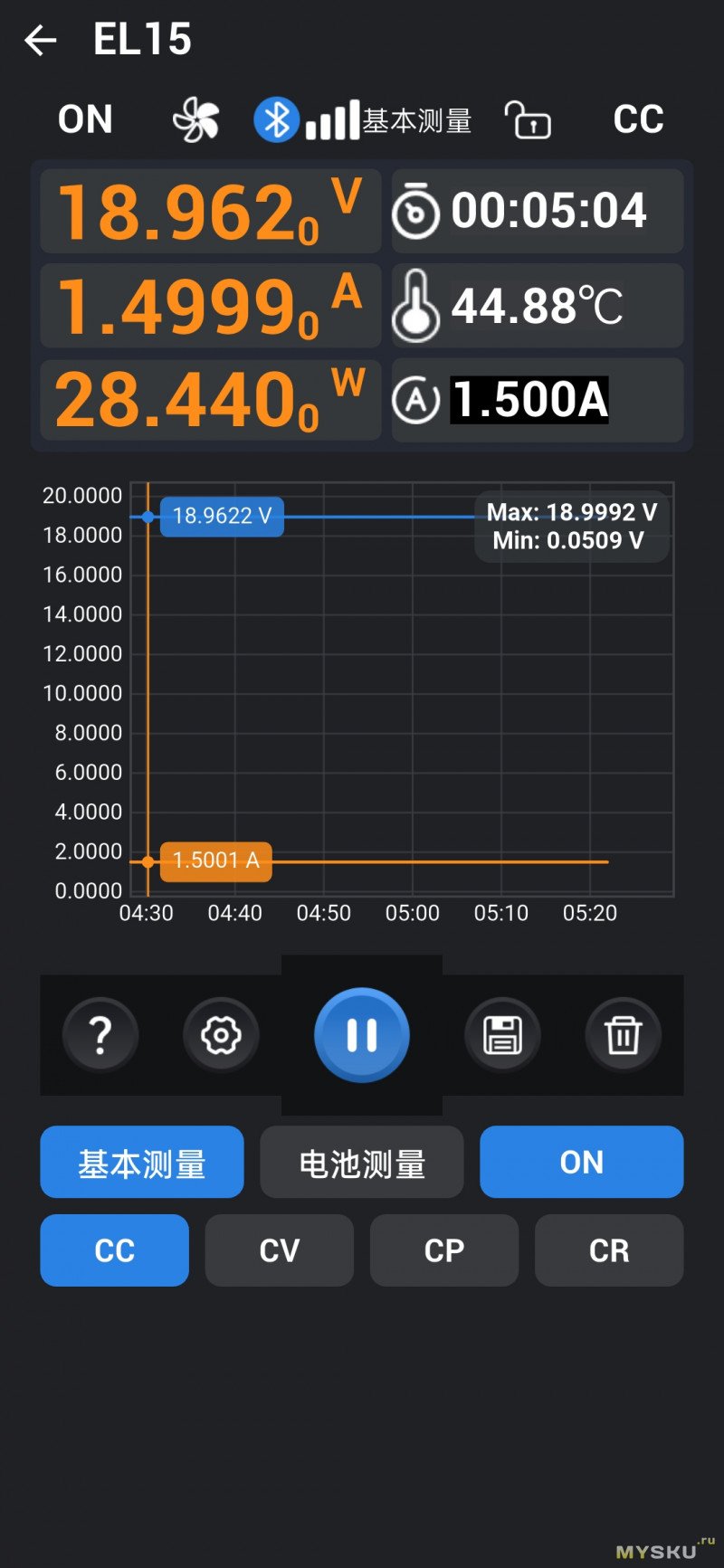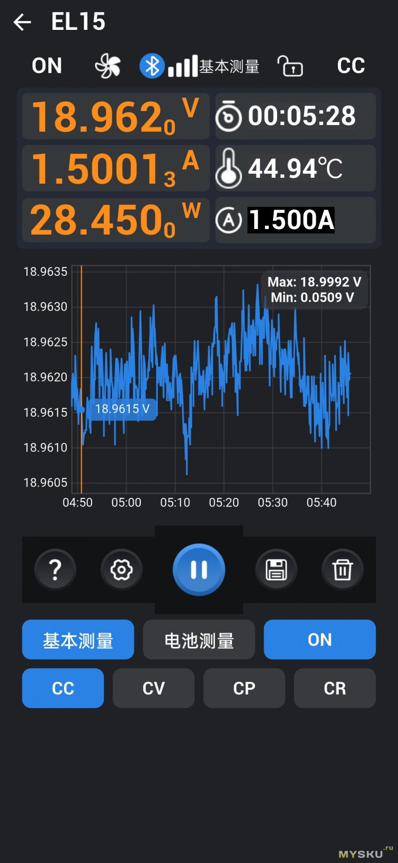 Главное окно Basic отображает текущее напряжение, ток и мощность. Справа — таймер, текущая собственного нагрева, установленный ток. Наверху на панели состояния — 5-лепестковая пиктограмма для визуального обозначения оборотов вентиляторов, OFF/ON — включить/выключить подачу питания на клеммы, режим стабилизации (CV / CC / CP / CR), значок замка (блокировка управления по долгому нажатию на кнопку вкл./выкл.)