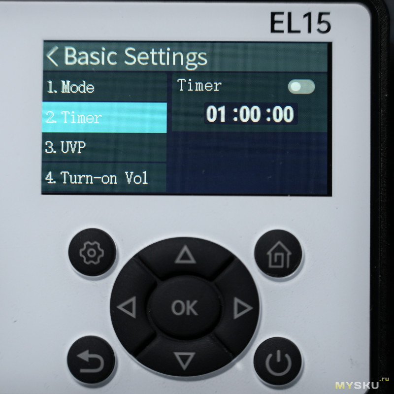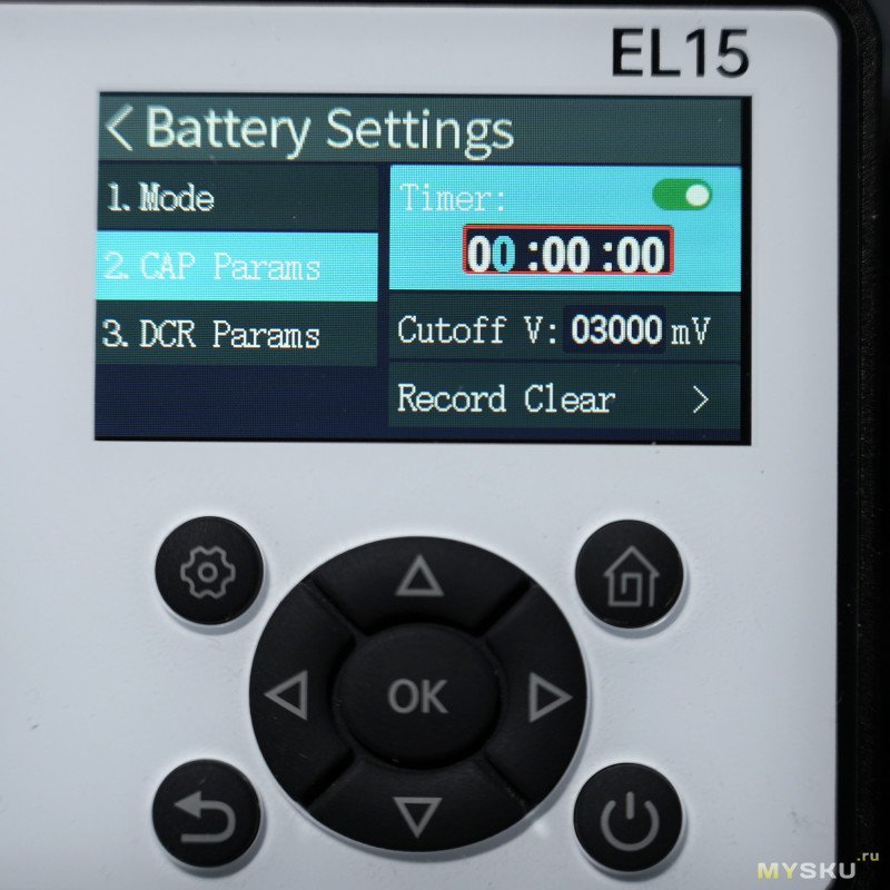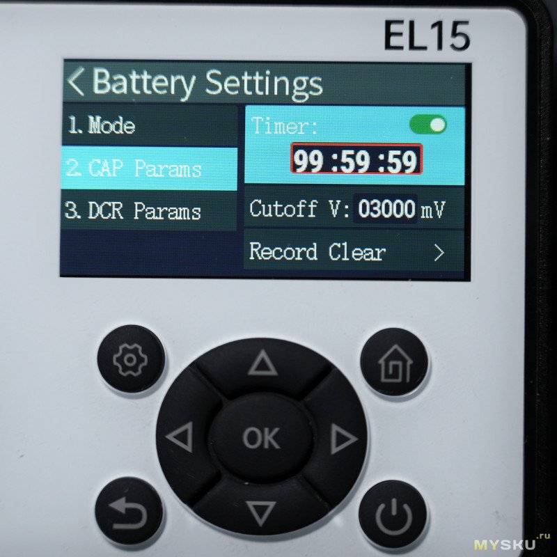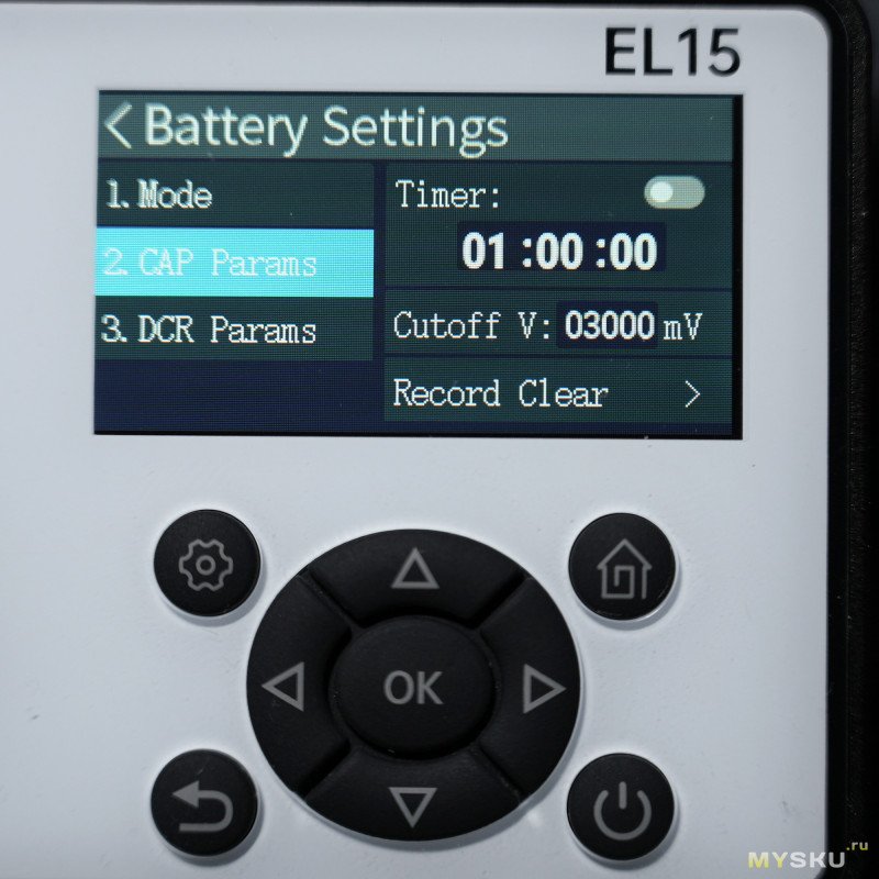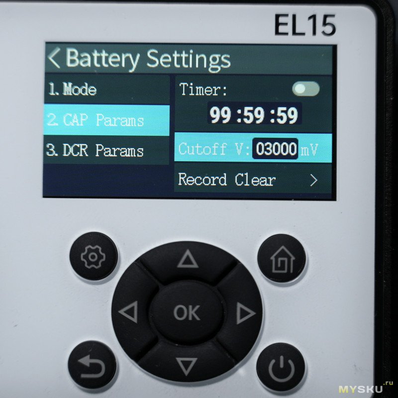 В режиме CAP можно настроить таймер, напряжение отсечки (100 мВ — 60 В) и сбросить счётчики.