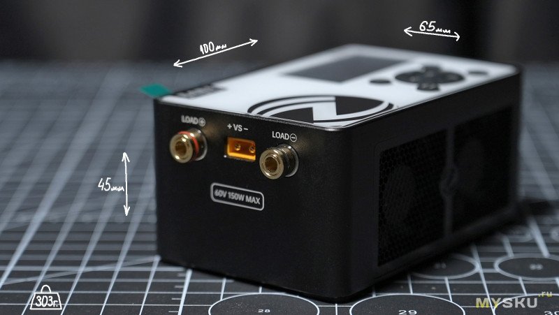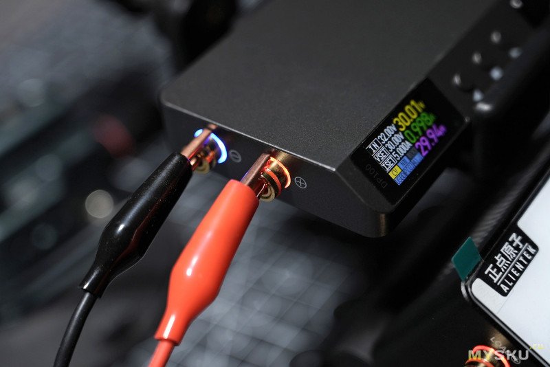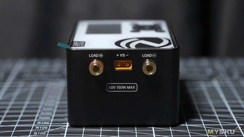 Сбоку находятся силовые разъёмы для подключения тестируемых источников питания — два разъёма banana с откручивающимися гайками, сквозные отверстия 2мм для продевания проводников имеются. Разъёмы помечены красным и чёрным кольцами для обозначения полярности, кроме того есть красная и синяя подсветка, которая светится во время активации. Девайс снабжён несколькими видами защит: