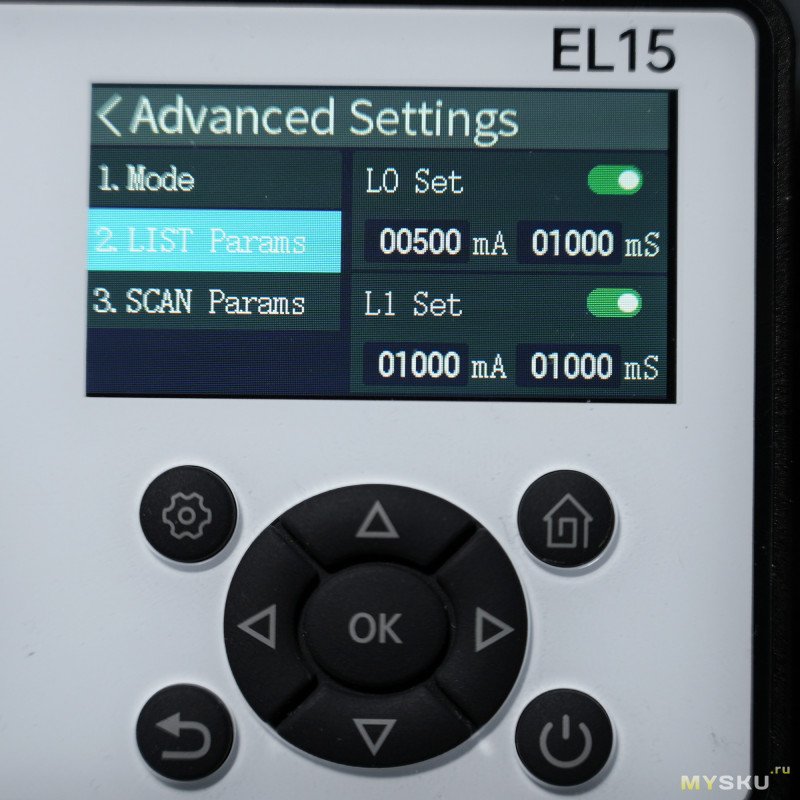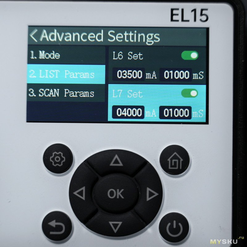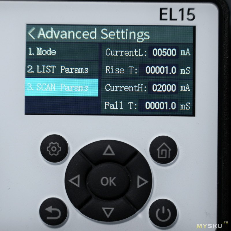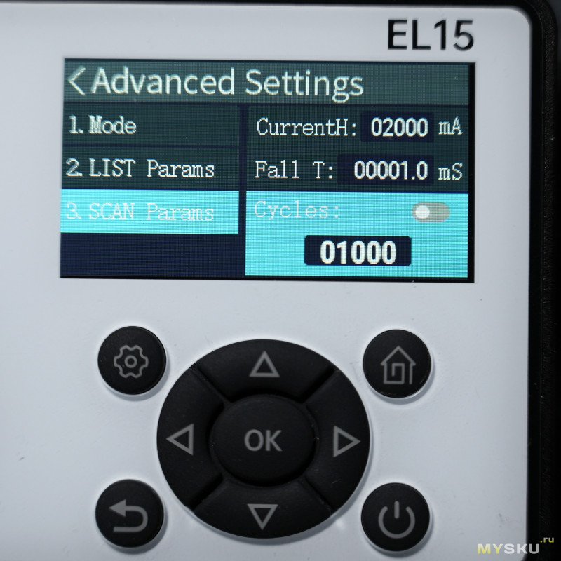 Этот многоступенчатый тест похож на предыдущий, смысл тот же — в циклическом прогоне токов с настраиваемыми интервалами для каждой точки, но теперь количество точек увеличено до 10 (если в подменю выбран режим List Test). Диапазон токов от 0 до 12А с шагом 1мА, а время импульса от 1 мс до 99.999 с. Режим Scan Test нужен для имитации непрерывного изменения тока нагрузки между пределами Current Low и Current High. Тут для настройки доступны четыре параметра:
