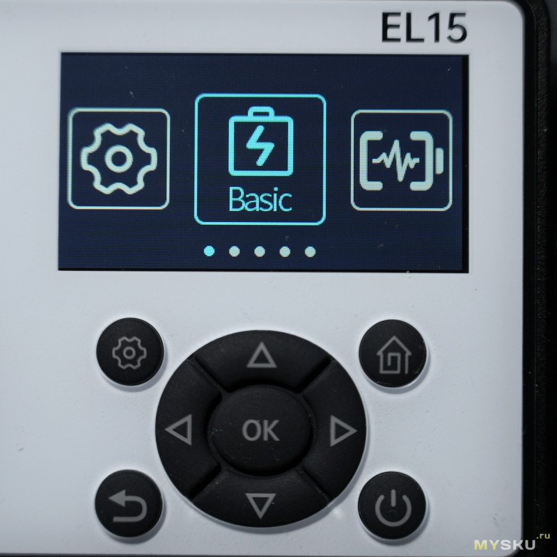 После подачи питания, на дисплее высвечивается карусельное меню с пятью разделами:— Basic (базовый режим тестирования)