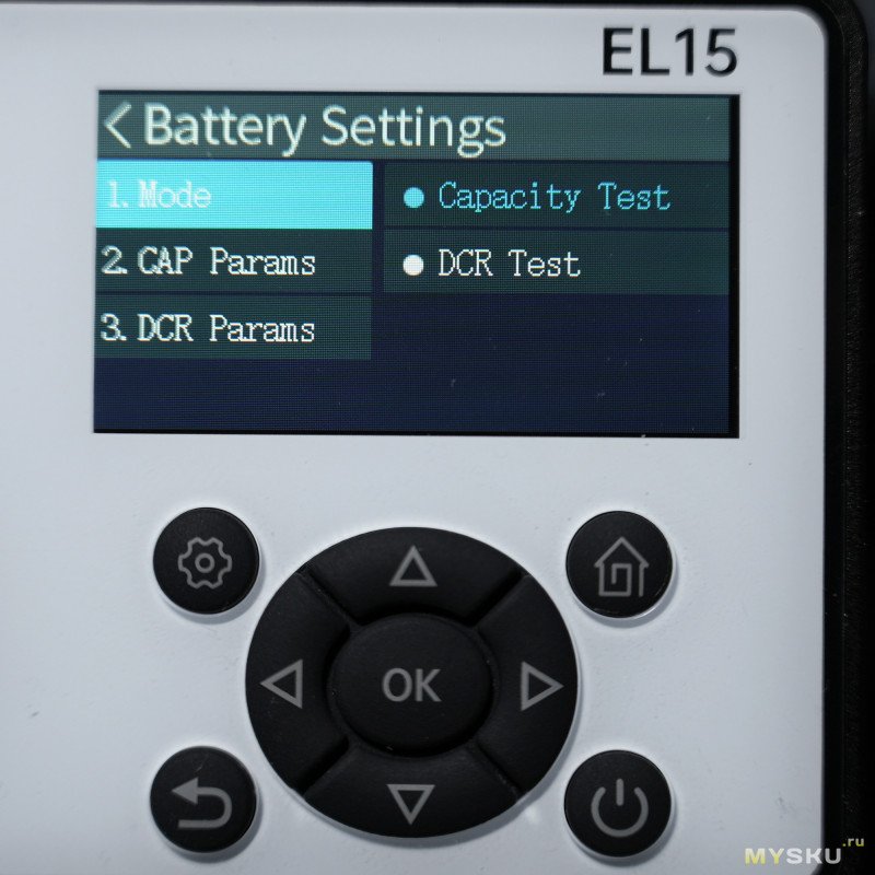Окно тестирования аккумуляторов. Главное окно по структуре похоже на Basic. Основной свод информации тот же, справа — таймер, установленный ток (до 12А), счётчик ёмкости. Если нажать ОК, то строка с настроенным током сменится на счётчик энергии. Из подменю можно выбрать один из двух режимов теста — CAP (измерение ёмкости) либо DCR (внутреннее сопротивление) с отдельными настраиваемыми параметрами.
