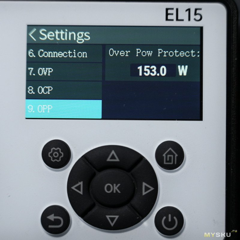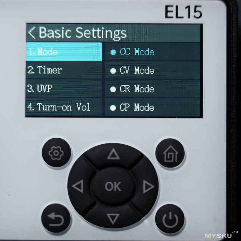 Настройка режима и стабилизации и другие опции доступны в специальном подменю, вызываемом по кнопке со значком шестерёнки. Режимы CV / CC / CP / CR выбираются в первом пункте: доступны режимы стабилизации по току, по напряжению, по мощности и по сопротивлению.