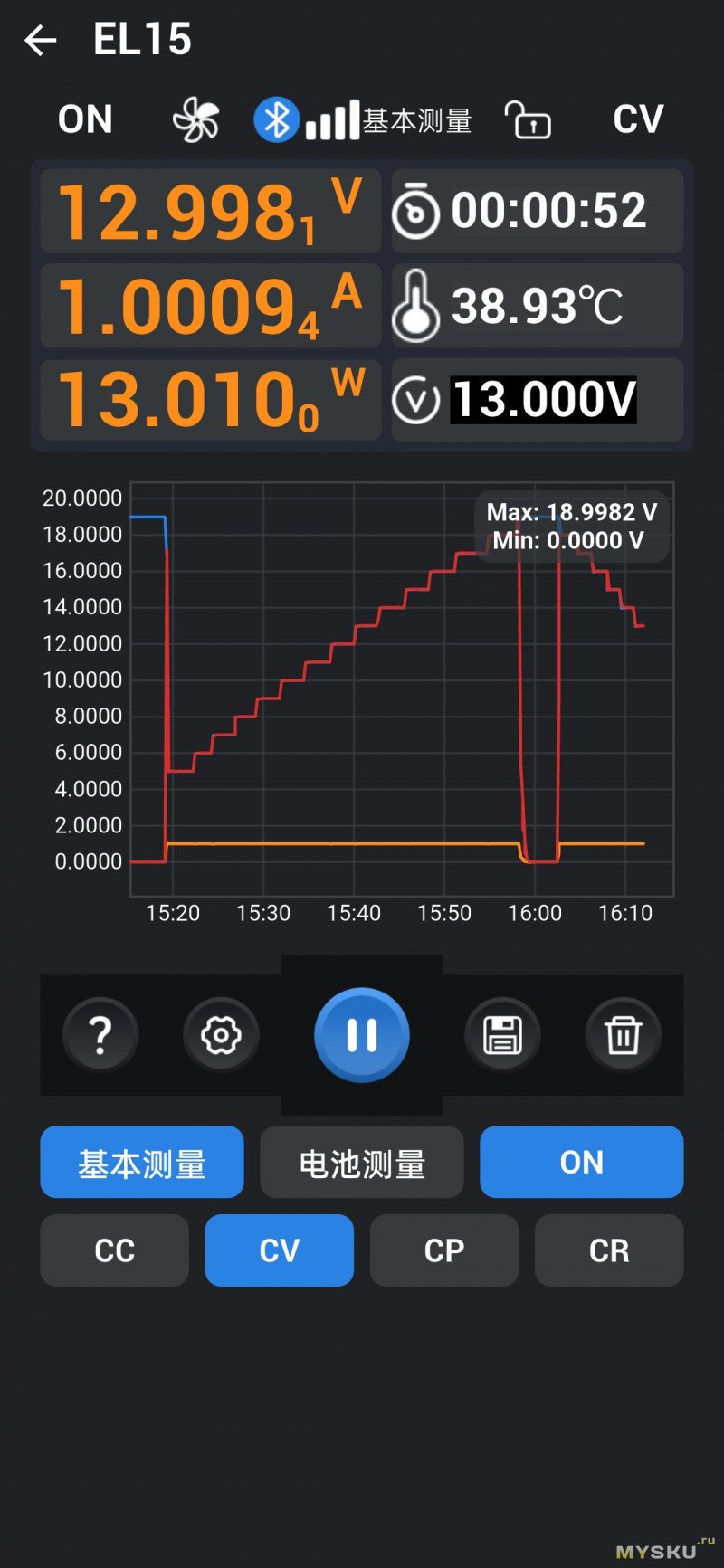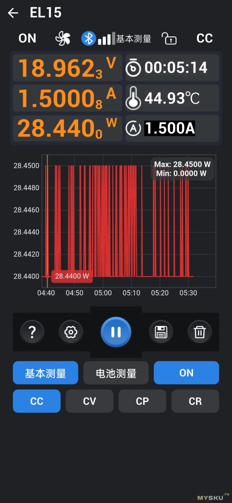 Приложение под Android называется ATK Xtool, оно универсально для других устройств от Alientek, язык китайский, но есть и английский, просто прописан тоже иероглифами — это я после всех тестов узнал. На главном экране отображается окно с графиком в реальном времени, напряжение, ток, мощность, температура нагрева. Среди режимов доступны Basic и Battery. Отдельные кнопки для выбора CV / CC / CP / CR. Кривые выборочно можно выбрать, что именно выводить на экран: напряжение, ток, мощность или всё вместе.![]() | ![]() | ![]() |