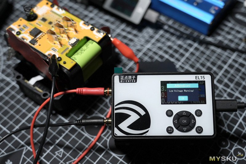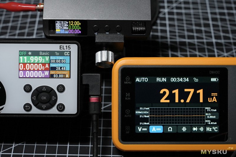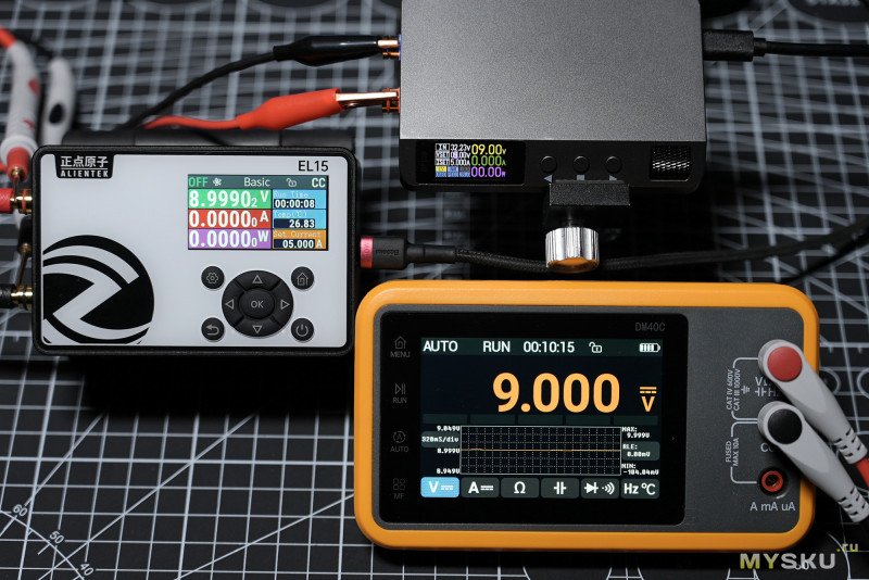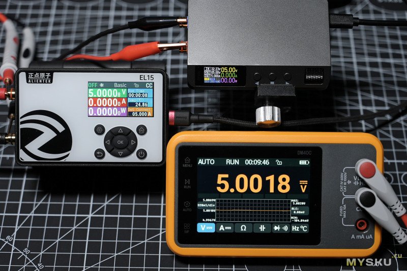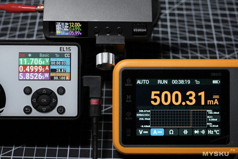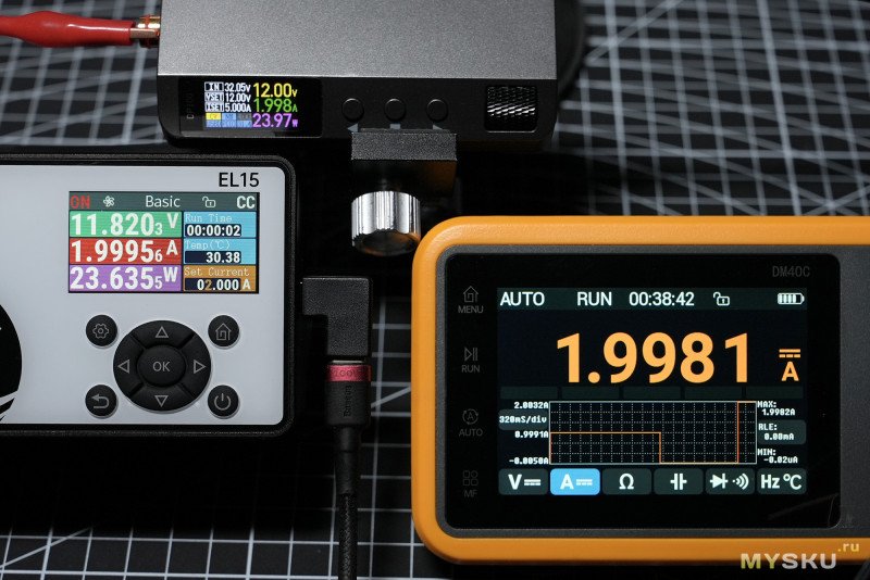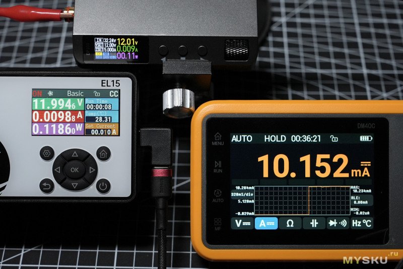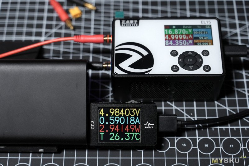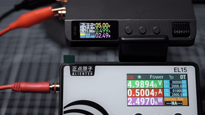(GIF) — тест циклический в режиме Power в связке с понижающим DC-DC преобразователем Alientek DP100, чередование 0.5А — 1А, интервал 2 сек.