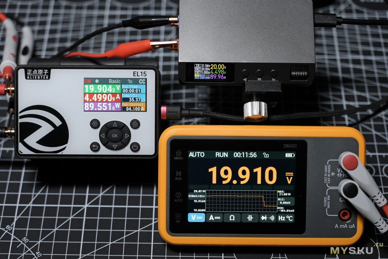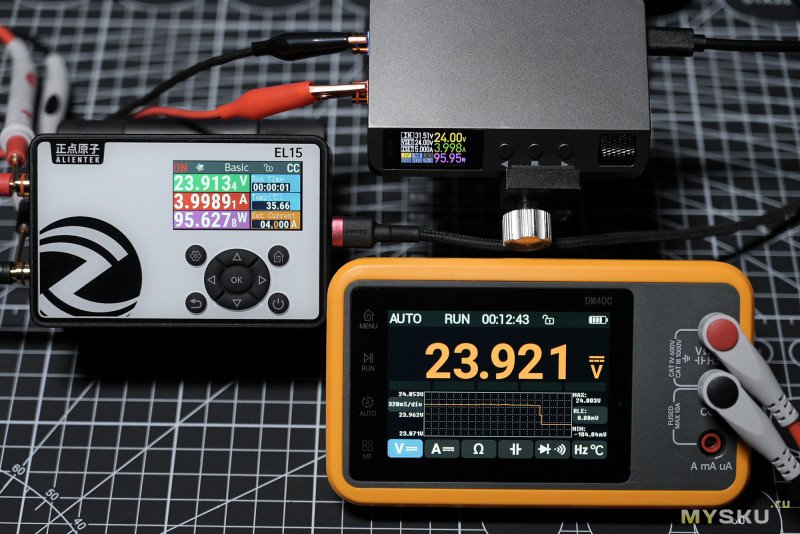 Сравним точность измерений напряжения, параллельно подключив мультиметр к клеммам нагрузки. Выше 30В добыть было неоткуда в данный момент, поэтому верхний предел в моём тесте ограничился этой отметкой. Слева скрины на холостом напряжении, справа под нагрузкой 5А, 4.5A, 4A и 3.5А, чтобы уложиться в мощность до 100Вт, которые являются пределом для DP100. Краткое предварительное резюме — весьма неплохая точность измерений даже при двухконтактном подключении в пределах 10мВ.