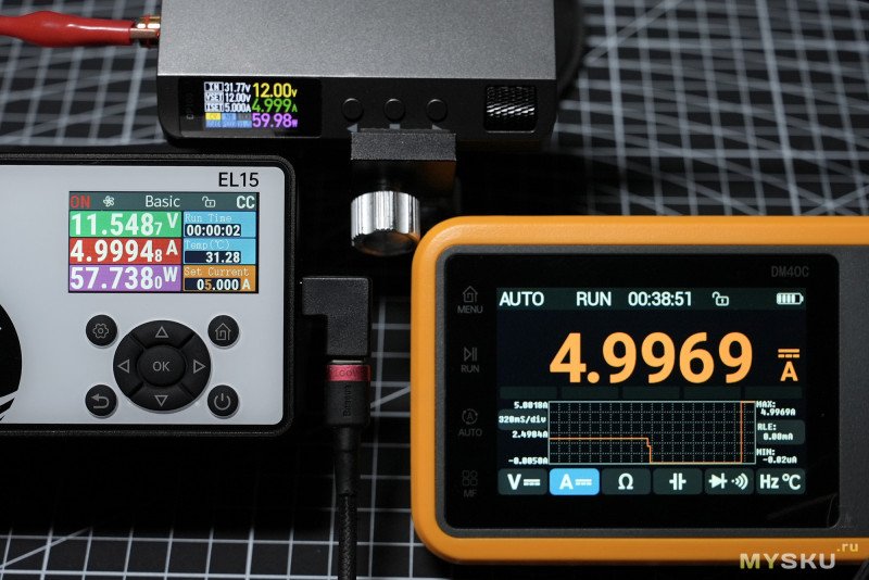 (видео) — тест циклический в режиме Advanced в связке с понижающим DC-DC преобразователем DP100, 10 точек от 0.5А до 5А с шагом 0.5А, интервал 2 сек.