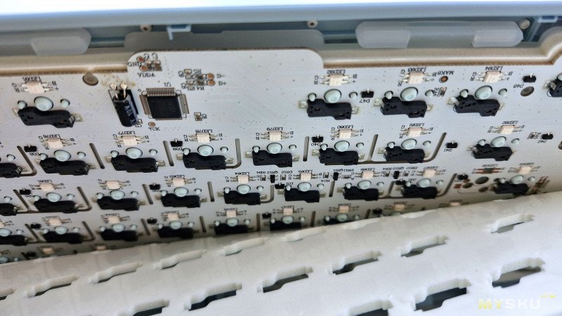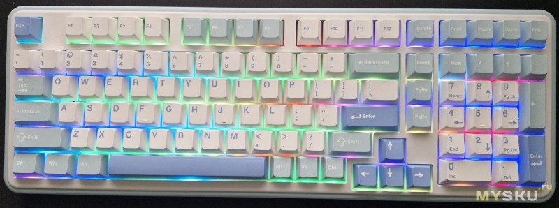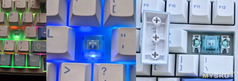 Под каждым снизу светодиод подсветки (но без световода). У длинных клавиш есть двойная поддержка (не люфтит). Характеристики установленных свитчей (3/5-pin):