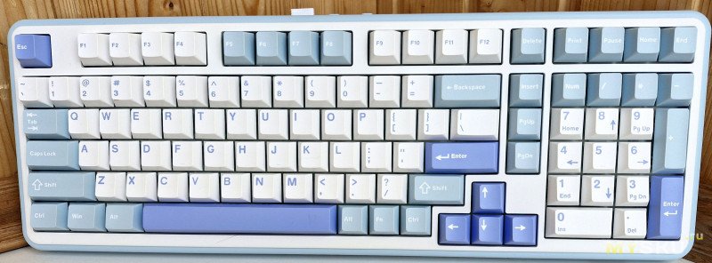 Epomaker TH99 выполнена в формате 96% раскладки (1800-style), что позволяет сохранить все ключевые функции полноразмерной клавиатуры (цифровая панель, функциональные клавиши, стрелки) при более компактных размерах. Но разбитый блок 3х3 «Home, End, Delete» и прилипший к стрелкам правый Shift поначалу вызывают дискомфорт, и требует привыкания. Энкодера и доп. клавиш для уровня громкости тут нет.