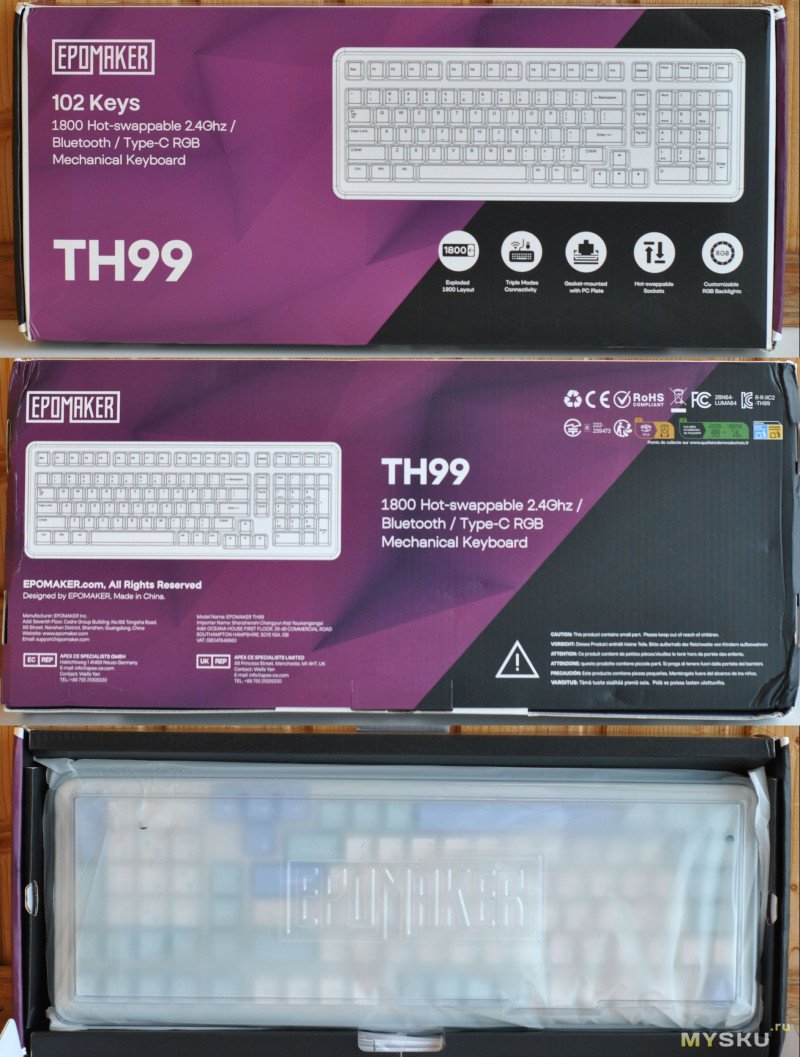 И снова Epomaker. На этот раз механическая клавиатура TH99 с раскладкой 96%. Корпус пластик, но многослойная структура для акустического комфорта, свитчи без экзотики — механические линейные Creamy Jade (с возможностью горячей замены). Из практичного: три режима подключения (кабель/2,4 ГГц/Bluetooth 5.0), двухуровневые ножки, фирменное ПО Epomaker и емкий аккумулятор 8000 мАч. Под катом очень краткий обзор.