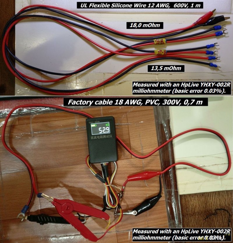 Я поступаю проще простого — беру миллиомметр (на фото HpLive YHXY-002R с самодельными проводами т.к. заводские а) короткие — вместе с зажимом ~ 45 см; б) постоянно путаются ибо не скреплены между собой для гибкости; в) из-за жёсткости часто сдёргивают зажим с детали, например померьте с ними калибровочную плату HpLive-R которая лежит рядом с прибором — можно, но… цапнул и не дыши! — малейший чих и зажим слетел) и измеряю сопротивление «вход — выход» разъёма и по нему смотрю что взять. Например для ЛБП с током 10А я тоже делал свои кабели взяв провод 12 AWG длиной метр и в итоге получил максимальное падение напряжения на петле менее 0,16V, а с заводским 70 см кабелем оно было около 0,6V — провода меньшего сечения, достаточно.