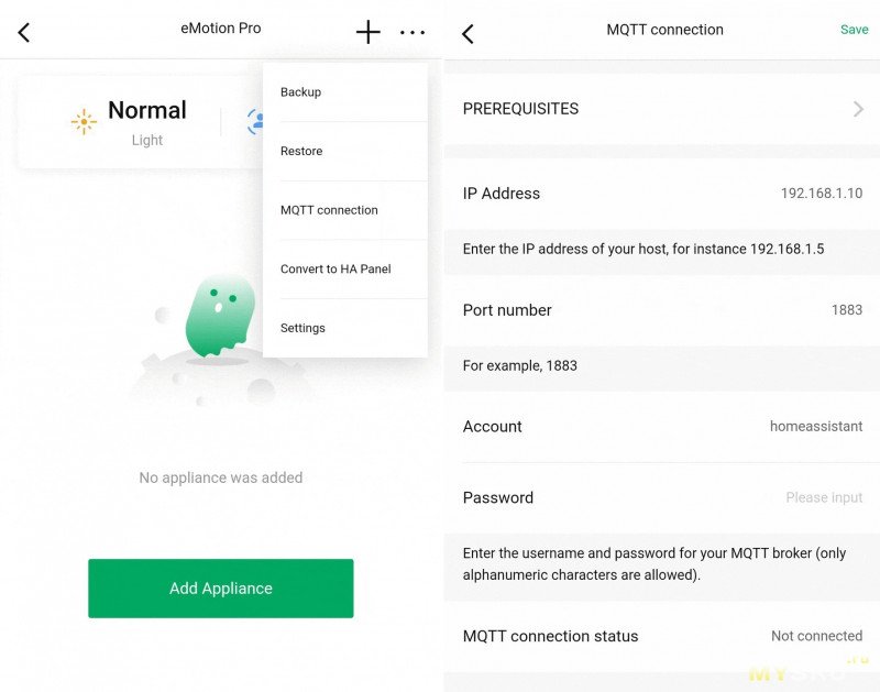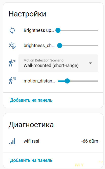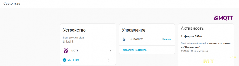 Настраивается максимально просто. Вводится адрес MQTT сервера, его порт, логин, пароль и всё. Устройство проброшено в MQTT и автоматически подтянуто в Home Assistant.