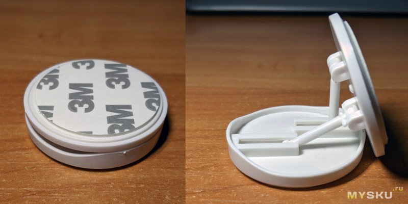 Насчёт крепления. Состоит оно из двух пластиковых частей с клейкой лентой, которые соединены «ножничным» механизмом, позволяющим регулировать угол наклона устройства. Я бы не стал испытывать его прочность, выглядит достаточно хлипко. Но для устройства с таким весом и габаритами, его прочности достаточно.