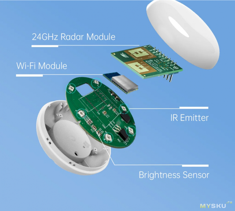Внутри находится микросхема, на которой распаяны модуль связи, радар, инфракрасные светодиоды (приёмо-передающие), а так же люксметр (сенсор яркости).