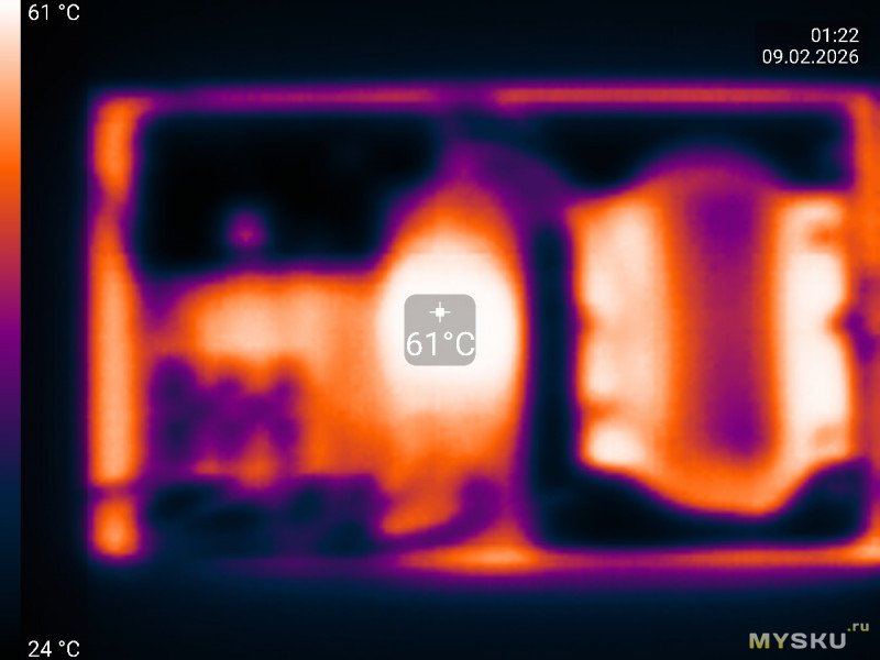 После этого включил прожектор и дал ему поработать полчаса уже от сети, а затем замерял получившуюся температуру. При работе на открытом воздухе драйвер разогрелся примерно до 65 градусов, самым горячим местом у него ожидаемо оказался дроссель, сам чип был чуть теплый: