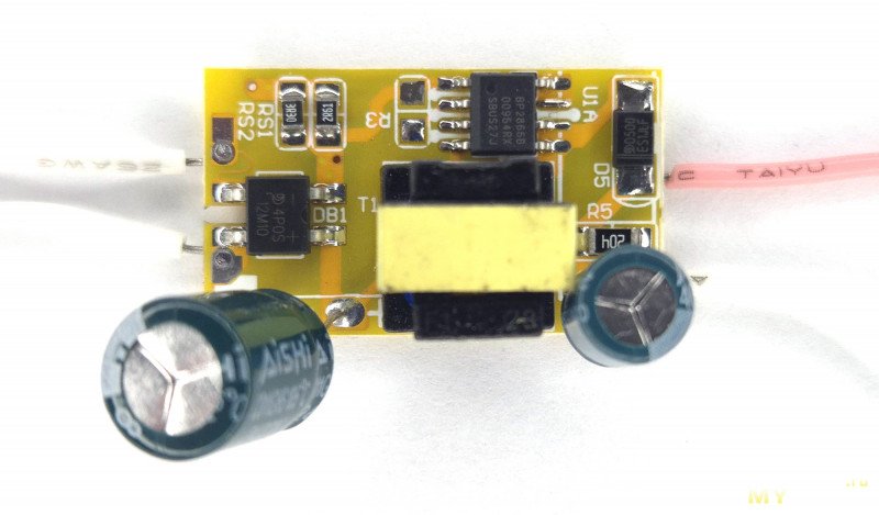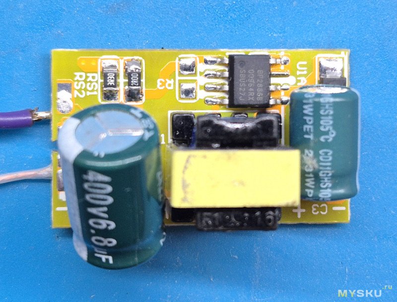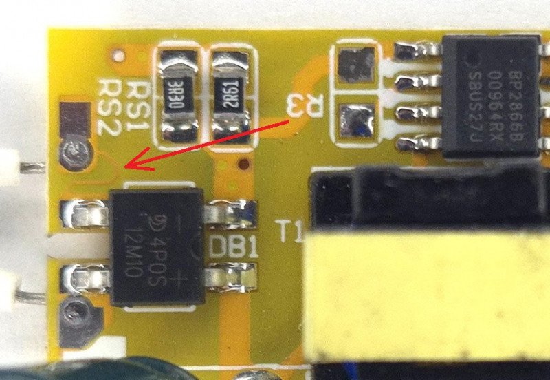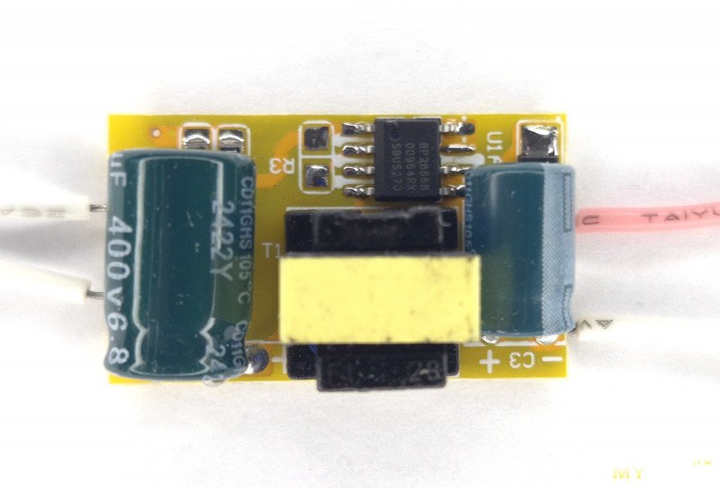 Основной (и единственный) чип преобразователя – BP2866B, представляющий собой понижающий преобразователь постоянного тока (buck CC) с минимумом внешних деталей: