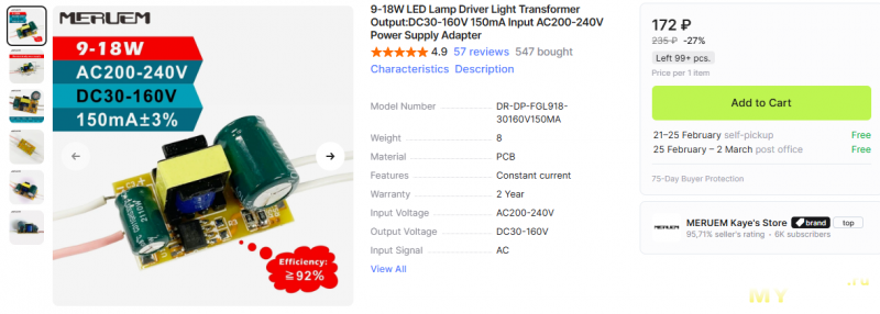 С помощью тестера я выяснил, что все 18 светодиодов прожектора соединены последовательно, образуя цепочку на рабочее напряжение примерно 59 В. А исходя из паспортной мощности светильника в 10 Вт и предположив, что КПД драйвера составляло около 90%, получилось, что ток через диоды должен быть равен 150 мА, что и должен обеспечивать новый драйвер. После этого на Али был найден обозреваемый лот, который подошел по всем параметрам: