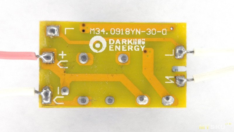 И это, кстати, не самое удачное решение, т.к. сильно затрудняет наиболее простой вариант крепления платы к корпусу с помощью двухстороннего скотча, а ведь других крепежных отверстий на плате нет. Зато снизу платы гордо красуется надпись «Темная энергия», призванная, видимо, компенсировать все остальные недостатки, самый главный из которых – это отсутствие какого-либо предохранителя (и даже его «аналога» в виде резистора) по входу.