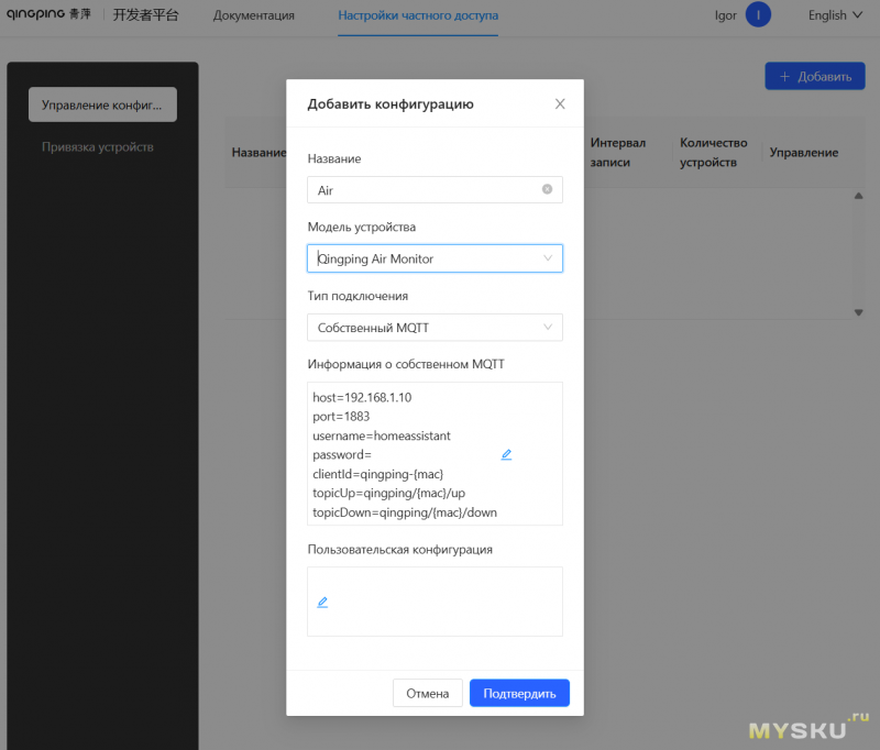 Нажать добавить конфигурацию, выбрать модель и прописать параметры вашего MQTT.